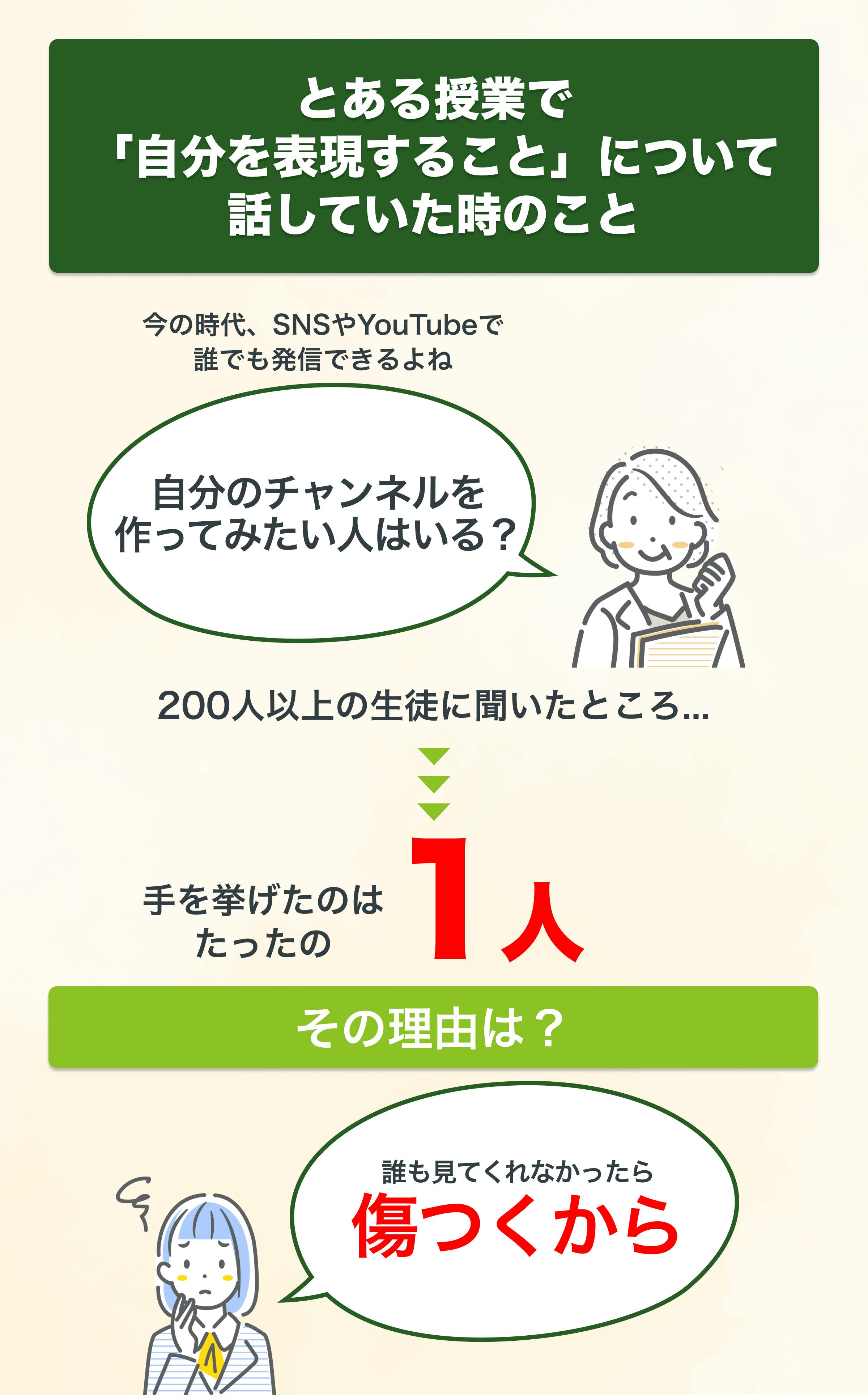 「今の時代、SNSやYouTubeで誰でも発信できるよね。自分のチャンネルを作ってみたい人はいる?」と200人以上の生徒に聞いたところ、手を挙げたのはたった1人。理由を聞くと「誰も見てくれなかったら傷つくから、最初からしない」という答えでした。
