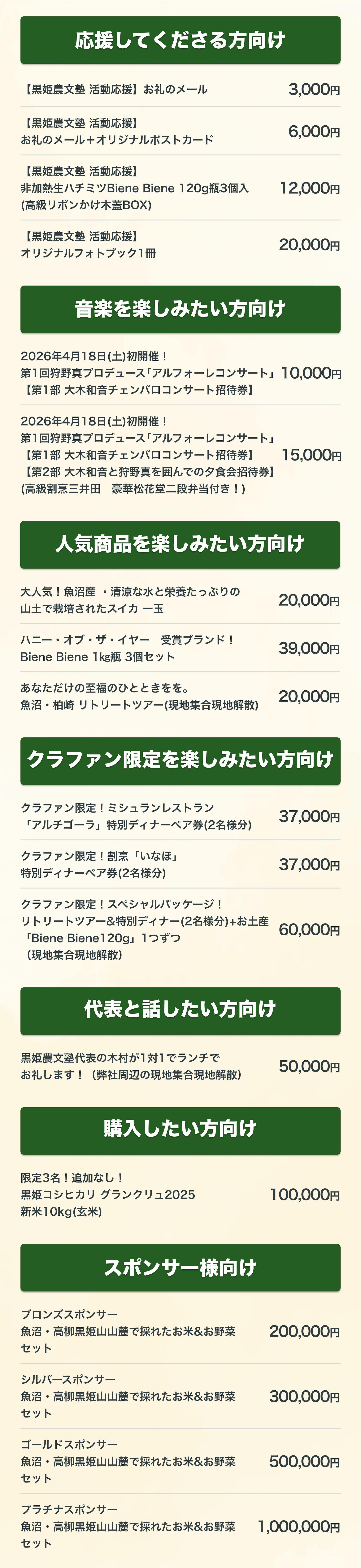 ご支援いただいた皆様には、心を込めて以下のリターンをご用意いたします。