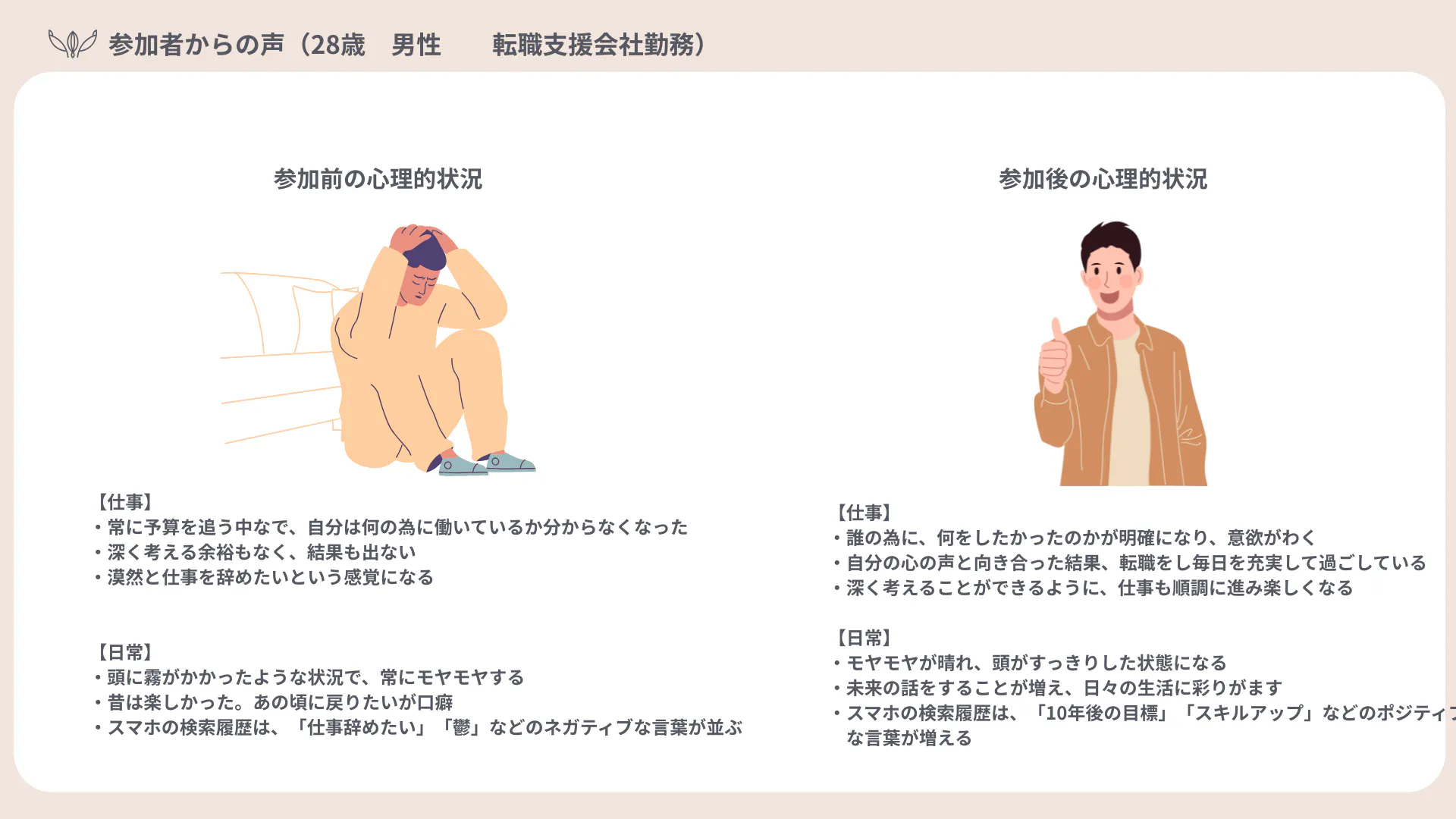 いただいたフィードバックは、・プログラム内容のブラッシュアップ・旅の導線設計・コーチング/カウンセリングの深度調整など、サービス全体の質向上に直結させています。
