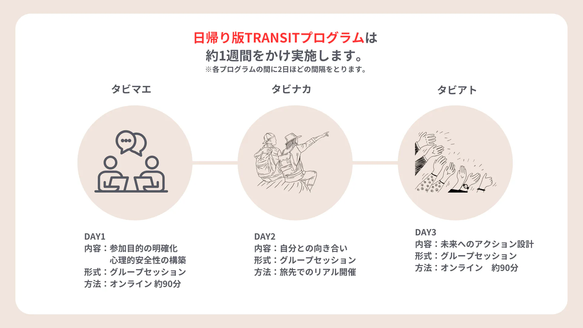 TRANSITは、「タビマエ(準備)」「タビナカ(体験)」「タビアト(未来設計)」という3つのプロセスで構成され、順に歩むことで、一時的な癒しではなく、「人生を次へ進める力」へと変わっていきます。