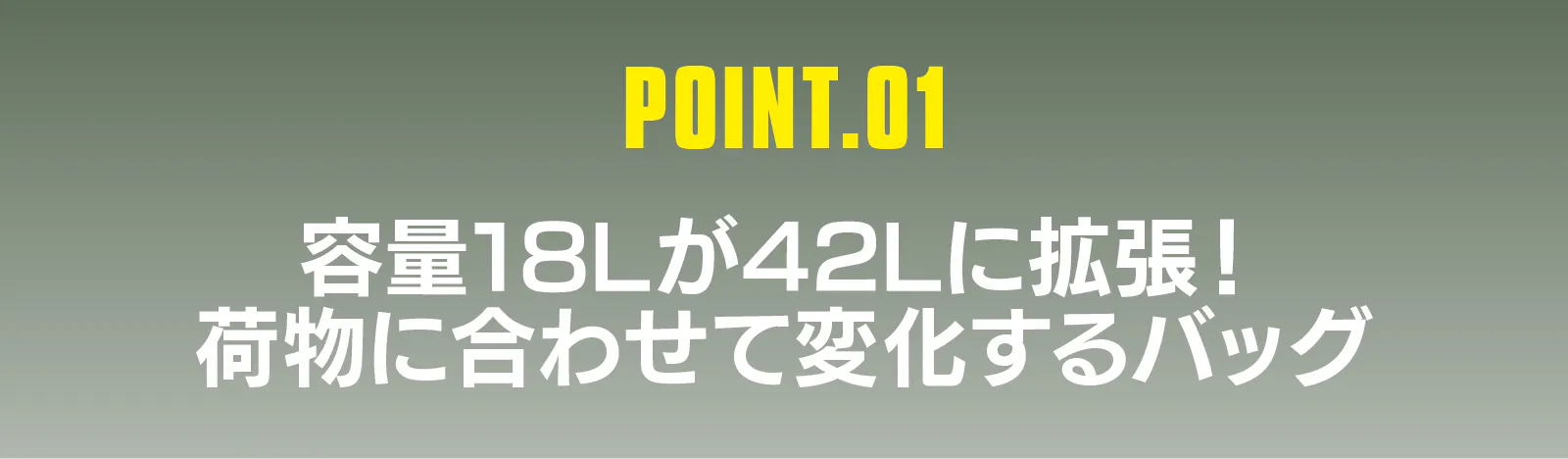 【FLEXY】は、18L・30L・最大42Lへとシーンに合わせて最大230%も容量を自在に変化できる多機能バックパックです。