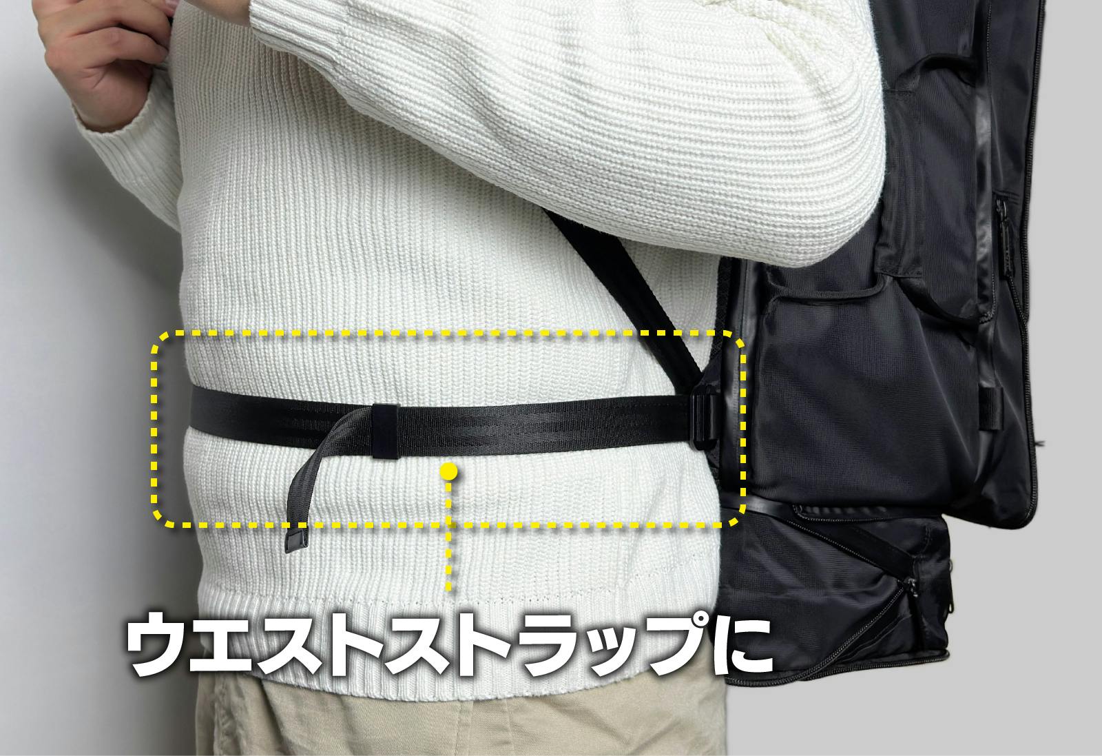 背面にはキャリーケースに固定できる“キャリーオンベルト”も標準装備。