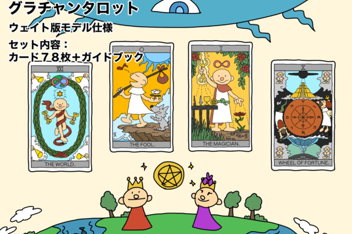 フリーハンドならではのロウブロウなタッチやSNSで登場するお馴染みのオリジナルキャラクターたちの可愛さが際立つ絵柄など細部までこだわったタロットカードです。