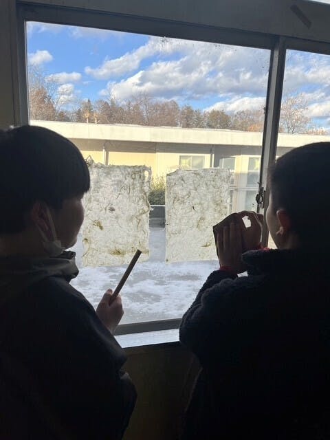 伊那小学校の先生からご連絡をいただいたのは2025年夏のことでした。子どもたちが3年間紙を漉く研究を続けてきたそうです。そんな中で、【作った紙で本を作りたい】という声が上がったそうです。実際に10月に学校を訪ね、3時間の授業をさせていただいた時、子どもたちの目の輝きに心を打たれました。ものづくりには慣れている小学6年生の皆さんでしたが、製本作業となると千差万別で、きめ細かなサポートが必要だということがよくわかりました。