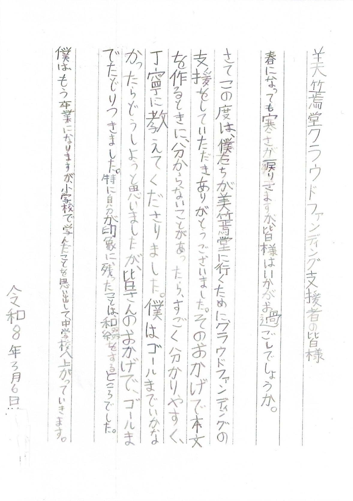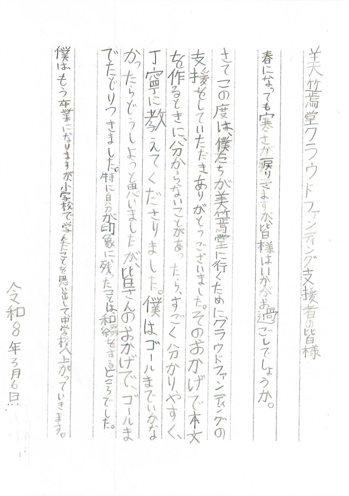 「何か小学生たちにできることはないですか?」と担任の先生にお話しいただきまして、お礼のお手紙を添えられたらとお伝えしました。私としましては、代表の子に「ありがとうございます!」と手書きしてもらえたら、とお伝えしていたのですが、
