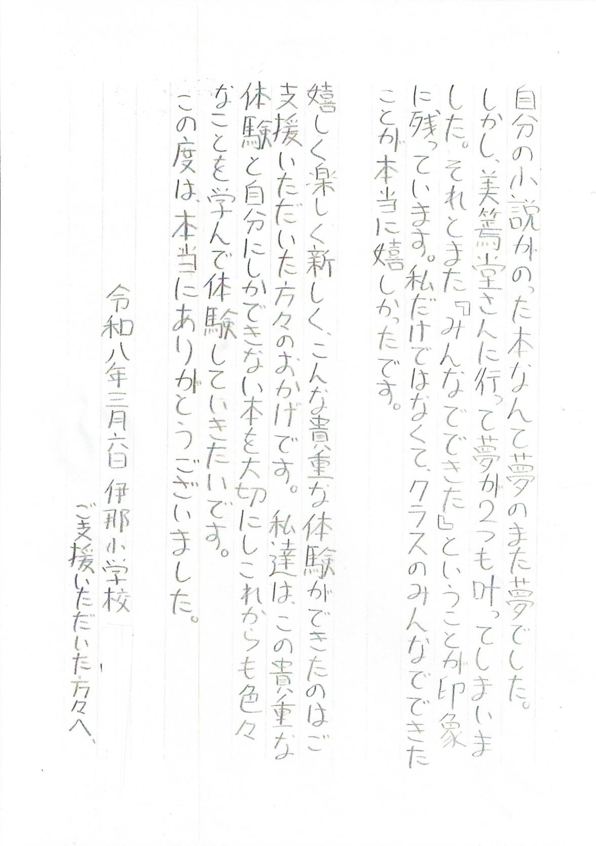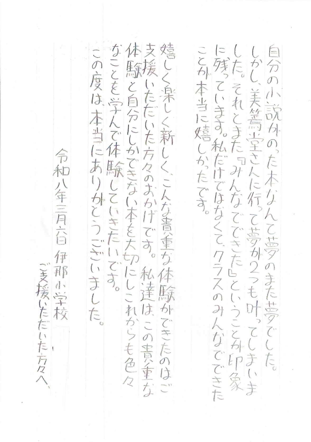伊那小学校のみなさまより、お礼のお手紙が届きました。
