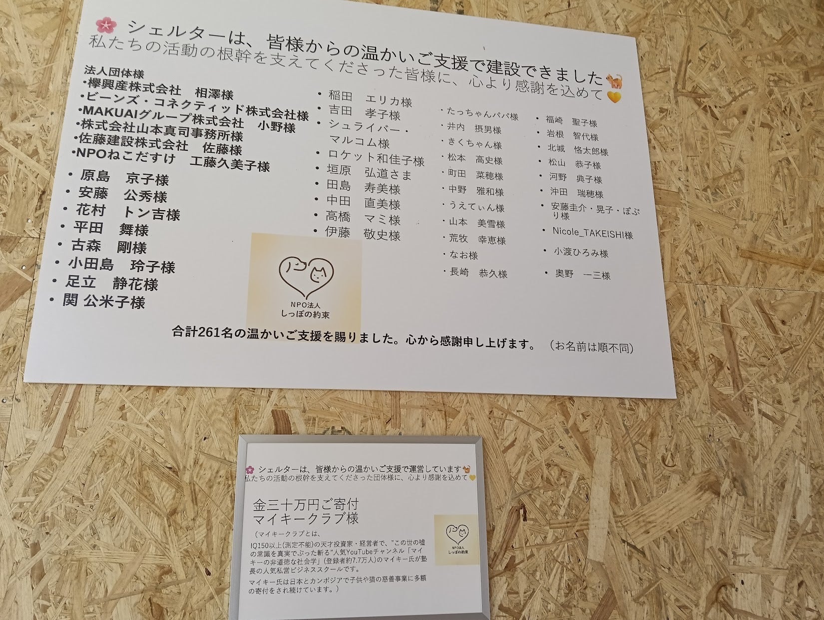 3万円以上のご寄付をしてくださった方には、2027年2月末日までの期間で、シェルター玄関にご寄付者方名版(ニックネーム可)を1年間掲示させていただきます。ニュースレタ送信させていただきます。シェルターへのご訪問大歓迎です(事前予約要)。