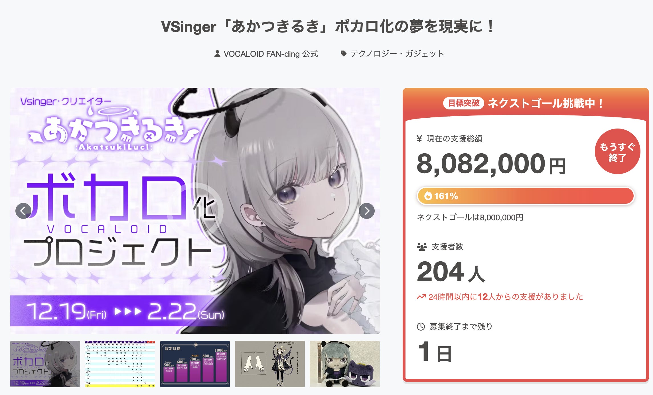 本日歌枠リレー配信中に第4目標突破!本日あかつきるきさん歌枠リレー配信を行なっている最中ん高額ご支援などもありなんと第4目標達成いたしました。ご支援ありがとうございます。配信リレーということで普段とはまた違う視聴者に見守られながら達成してあかつきるきさんも喜びを隠せないご様子でしたね!! 体調不良とのことでしたが、それでも歌うことが大好きで、少しでも多くの方々に歌声を届けようというその有志を是非ご覧ください。ちなみに本日ご支援多くいただき、CAMPFIRE 人気ランキング テクノロジー・ガジェット部門で1位をとっております!!明日22日クラファン終了みまもり & 歌枠配信 いよいよ明日は2ヶ月間のクラファン期間の最終日!あかつきるきさんがみまもり配信を実施します。もちろん歌枠です。多くの皆様のご支援もありここまで歩んでこれました。その最後の瞬間を是非皆様と一緒に迎えていただければと思っております。視聴予約設定を忘れずに!!そして第5目標の1000万円までとどくのか!?最終日の伸びにも注目です。クラファン支援は時間に余裕を持ったご支援を!VOCALOID FAN-ding 第1弾足立レイのクラファンでは終了30分前ぐらいに支払いエラーで購入できなかった視聴者の方もいらっしゃいましたので、お悩みの方はしっかりと余裕を持ってご支援ご検討ください。あかつき るき 3rd ワンマンライブ#カキカケノオト- AR Acoustic Live -歌うことが大好きなあかつきるきさんはライブも大好き!3rdワンマンライブのチケット予約も2月26日(木)23:59までとのことですのでクラファン支援とご一緒にどうぞ。ARアコースティックライブとのことで一味違うライブが楽しめる!?https://x.com/AkatsukiLuci/status/2021509521504698486
