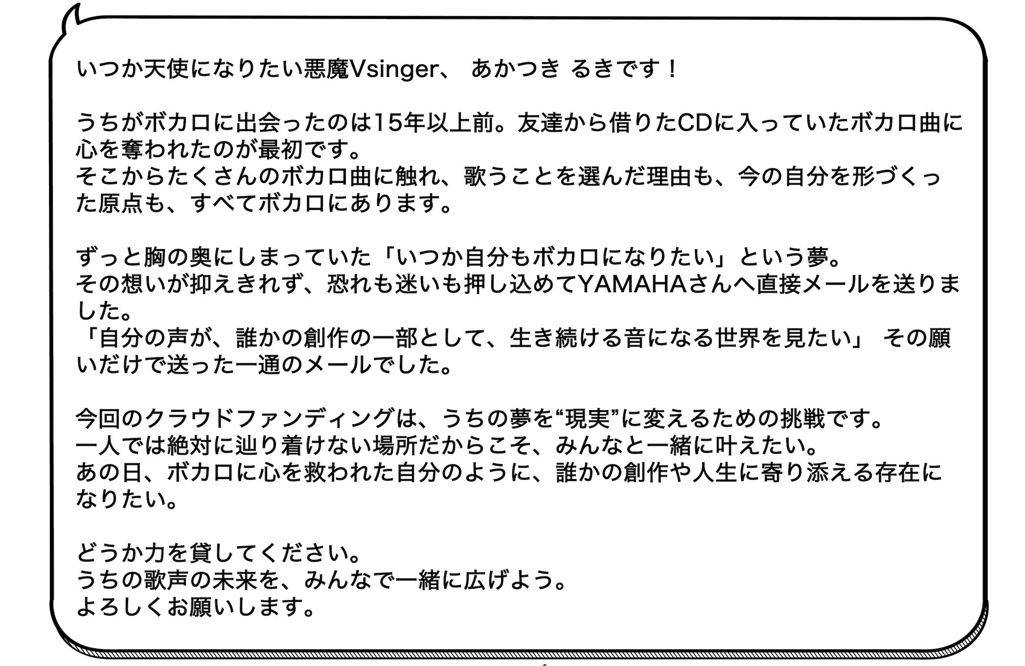 ヤマハはこのサービスを通してボカロを夢見る挑戦者と、その挑戦者を応援したいファンの方々の想いを繋ぎ、ボカロ化に必要な資金面・制作面を全力で支援していきます。