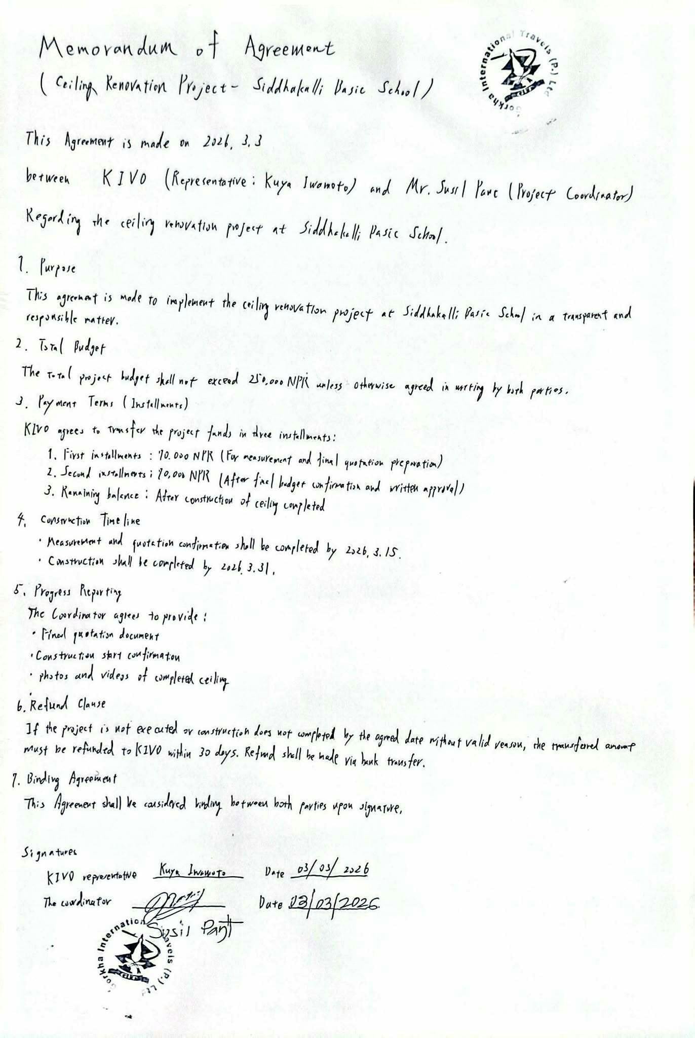 また、本プロジェクトを円滑かつ透明性をもって進めるため、KIVOと現地コーディネーターの間でプロジェクト実施に関する合意書(Memorandum of Agreement)を作成し、工事の進行条件や資金管理について双方で確認を行いました。今後はこの合意内容に基づき、進捗を確認しながらプロジェクトを進めてまいります。