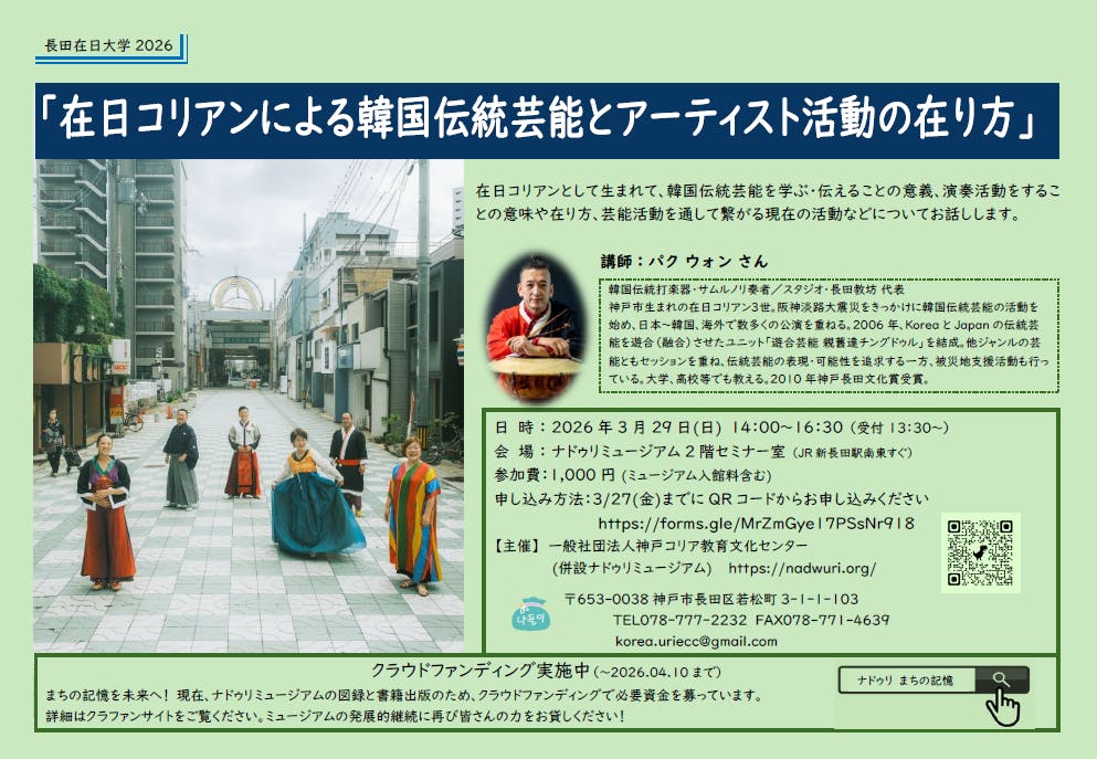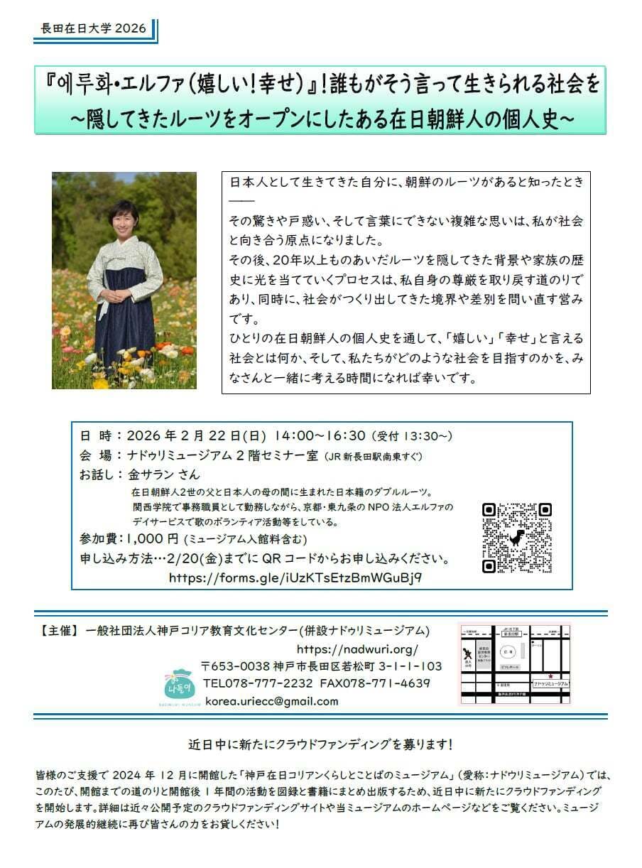2026/02/19 08:34ご支援者の皆様このたびはナドウリミュージアムへの暖かいご支援をありがとうございます。心より御礼申し上げます。ミュージアムより開催予定のイベントなど定期的にお知らせしたいと思っています。どうぞよろしくお願い申し上げます。今週の日曜日2月22日(日)は下記の要領で長田在日大学が開催されます。お時間、ご都合が合う方はどうぞご参加ください。『에루화•エルファ(嬉しい!幸せ)』!誰もがそう言って生きられる社会を~隠してきたルーツをオープンにしたある在日朝鮮人の個人史~』日 時 : 2026年2月22日(日) 14:00~16:30会 場 : ナドゥリミュージアム2階セミナー室 (JR新長田駅南東すぐ)お話し : 金サラン さん(在日朝鮮人2世の父と日本人の母の間に生まれた日本籍のダブルルーツ。関西学院で事務職員として勤務しながら、京都・東九条のNPO法人エルファのデイサービスで歌のボランティア活動等をしている)参加費:1,000円 (ミュージアム入館料含む)申し込み方法…2/20(金)までにチラシのQRコードからお申し込みください。オンライン受講の方へは事前にアクセス情報等をお知らせします。まだまだ寒い日が続いております。どうぞご自愛ください。 もっと見る
