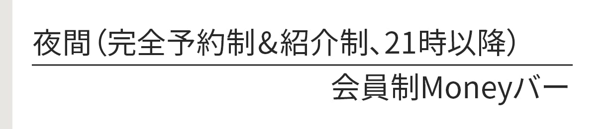・夜間(月水金20時以降)は完全予約制&紹介制の会員制Moneyバー。