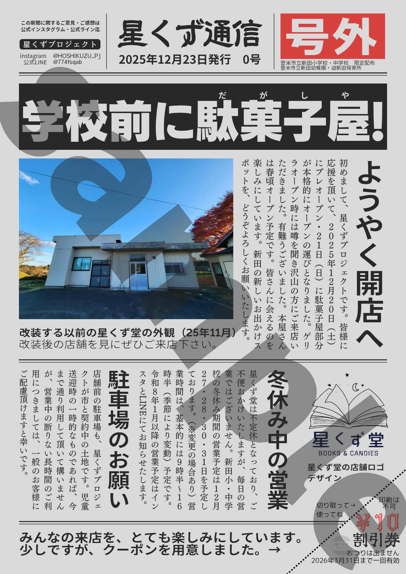 2026/03/04 09:38どうも!星くずプロジェクトです★★★最近、駄菓子の詰め合わせセットのご依頼が増えています。星くず堂の、いつもの仕事のひとコマです。今回は、栗原市のとある子ども会から300円 × 12人分のご注文をいただきました。袋を受け取って、開けるまでのあいだ。まだ会ったことのない子どもたちの顔を想像しながら、ひとつひとつ詰めています。ラッピングも、毎回少しずつアレンジ。今回は、わら半紙を使った包みにしました。決まった形で続ければいいのに、つい毎回変えてしまう。自分に小さな試練を課すのが好きな性分なのかもしれません。こうした日々の小さな仕事の積み重ねが、星くず堂の活動につながっています。そして今回のクラウドファンディングでも、こうした日々の営みを支えていただいています。改めて、本当にありがとうございます。クラウドファンディングを通して、本屋の仕事や日々の様子も、これから少しずつお届けしていけたらと思います。引き続き、どうぞよろしくお願いいたします。まだ会ったことのない子どもたちの顔を思い浮かべながら、ひとつひとつ、詰めています。ラッピングは、わら半紙。ご依頼ごとに少しづつ変えています。飾りのスタンプも毎回ランダムです。【あたり】がでたら、ラッキー!星くず堂に持ってきてね★ もっと見る