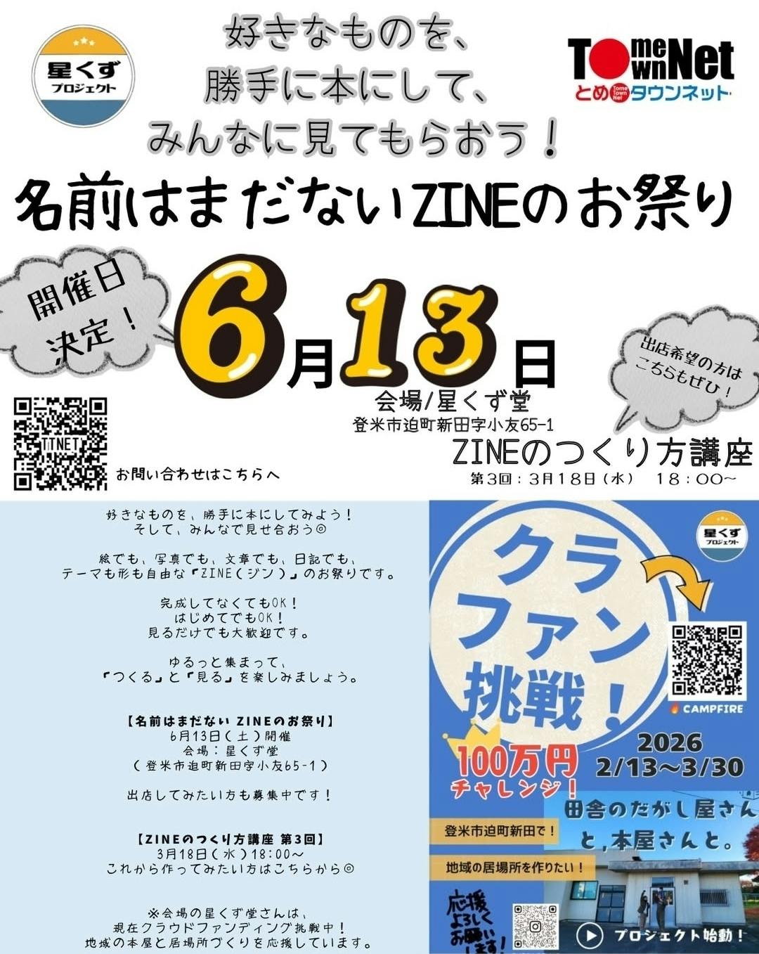 2026/03/02 12:12こんにちは、星くずプロジェクトです★★★今回はご報告…。先日プロジェクトメンバーは仙台の【ZINEフェス】に一般参列して参りました!戦利品の数々…どれも個性的で素敵\6月13日開催決定!/ 「名前はまだないZINEのお祭り」やります♫好きなものを、勝手に本にして、 みんなで見せ合おう!絵でも、写真でも、文章でも、日記でも。 テーマも形も自由な「ZINE(ジン)」のお祭りです。✔ 完成してなくてもOK ✔ はじめてでもOK ✔ 見るだけ参加も大歓迎!ゆるっと集まって、 「つくる」と「見る」を一緒に楽しみましょう◎★■開催日 2026年6月13日(土)■会場 星くず堂(登米市迫町新田字小友65-1)出店してみたい方も募集中です!★\これから作ってみたい方へ/ ZINEのつくり方講座 第3回 3月18日(水)18:00〜 はじめての方でも大丈夫。ここから一緒に始められます◎★この場所が続いていくことが、このお祭りの土台にもなっています。ぜひ応援・シェアもよろしくお願いします!★「好き」を持ち寄る、小さな文化祭のような一日。 あなたの“つくってみたい”を、ここで形にしてみませんか?ご参加お待ちしています!引き続き、クラファンの応援、シェアのほどよろしくおねがいします。ぜひ、ZINE興味ある方にも届けて頂きたいです。_(⁎ᴗ͈ˬᴗ͈⁎)_ もっと見る