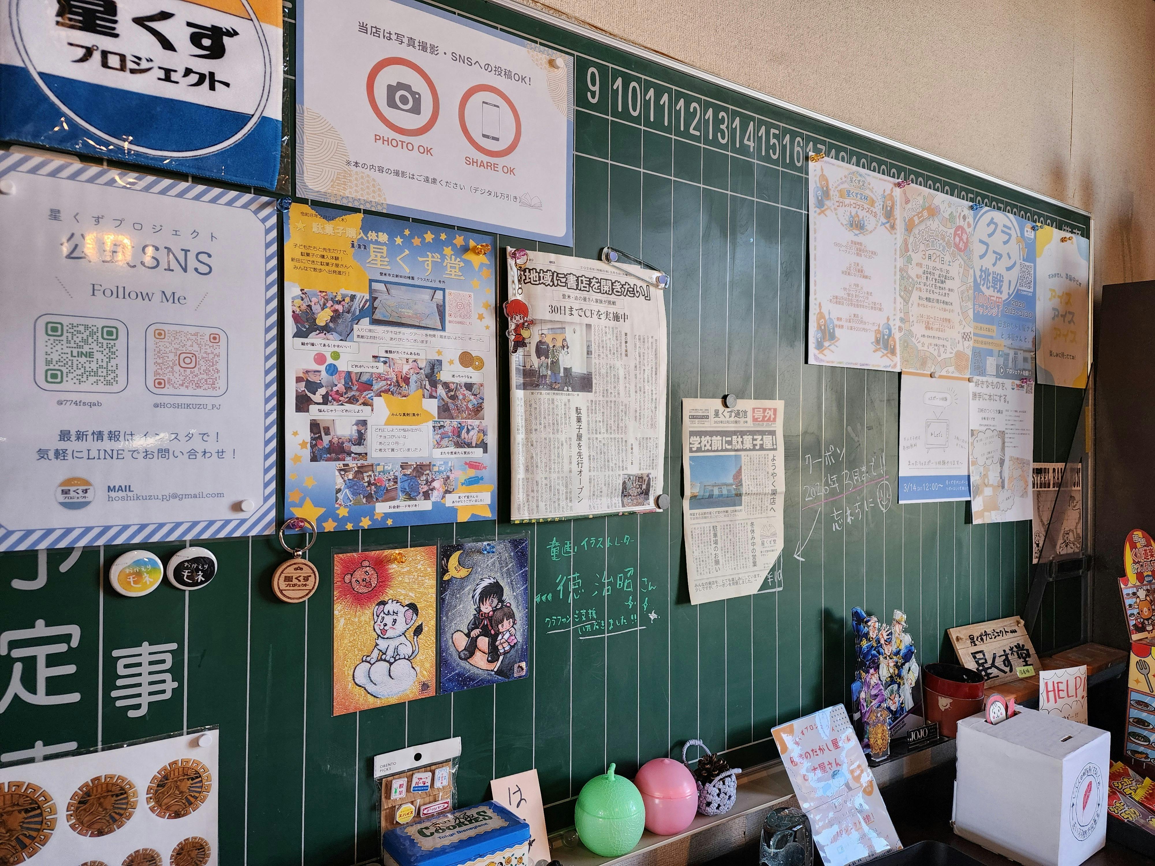 だがし屋さんと本屋さんのお店部分は「星くず堂」という看板で親しまれています。「くず」というとマイナスのイメージですが、星くずと名付けることでアイテムに愛おしさが生まれます。古本は、読んだ人から次に手に取ってくれる人への流れ星のような願いのバトンです。キラキラ輝くみんなの思いが集まった空間を作り上げていきたいと考えています。