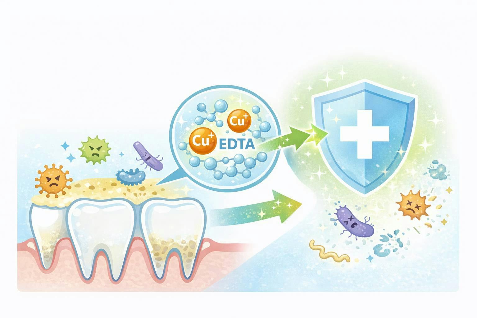 キレート銅イオンは、歯周病の原因となる複数の口内細菌に対して、特定せずに幅広く働きかけることを目的とした技術です。この仕組みは、人体への影響を抑えながら細菌の増殖を抑制することを前提に設計されています。 ※詳しい作用機序については、別途ホームページにてに公開しております。