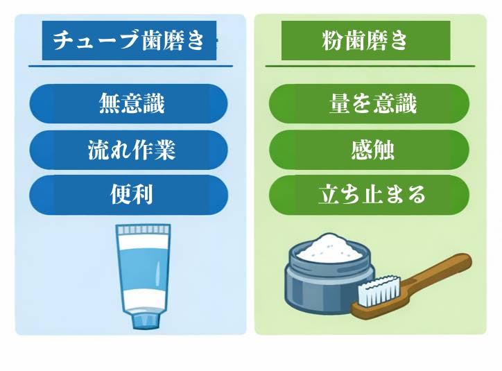 なぜ、粉歯磨きなのか。それは、「歯磨きがいつの間にか考えなくてもできる作業になっている」ことに違和感を覚えたからです。チューブの歯磨き粉は便利です。でも、便利さは意識を奪います。粉歯磨きは、ほんの少しだけ手間がかかります。量を意識し、感触の違いを感じる。その一瞬の立ち止まりが、歯ぐきに意識を向ける時間を生み出します。粉は、歯磨きを「作業」から予防の時間へ戻すための形です。