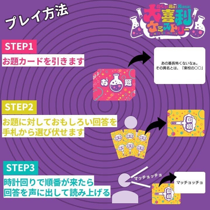 このノウハウを詰め込み、「見る専」だった方が今日から「主役」になれるカードゲーム『大喜利ケミストリー』を制作しました。