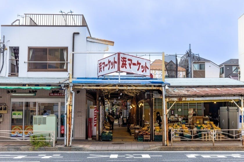 横浜市磯子区にある浜マーケットは、戦後の闇市から始まった歴史ある商店街です。全長およそ140mのアーケードの下には、青果店、惣菜店、鮮魚店など、約20軒の店が軒を連ねています。古い木造の店同士が向かい合い、店主とお客さんが名前で呼び合う光景が、今も当たり前のように続いています。