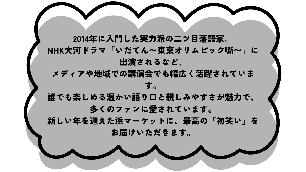 新年にぴったりの「初笑い」を、浜マーケットのど真ん中で。高座を囲みながら、一年の始まりをみんなで笑い合う時間をつくります。