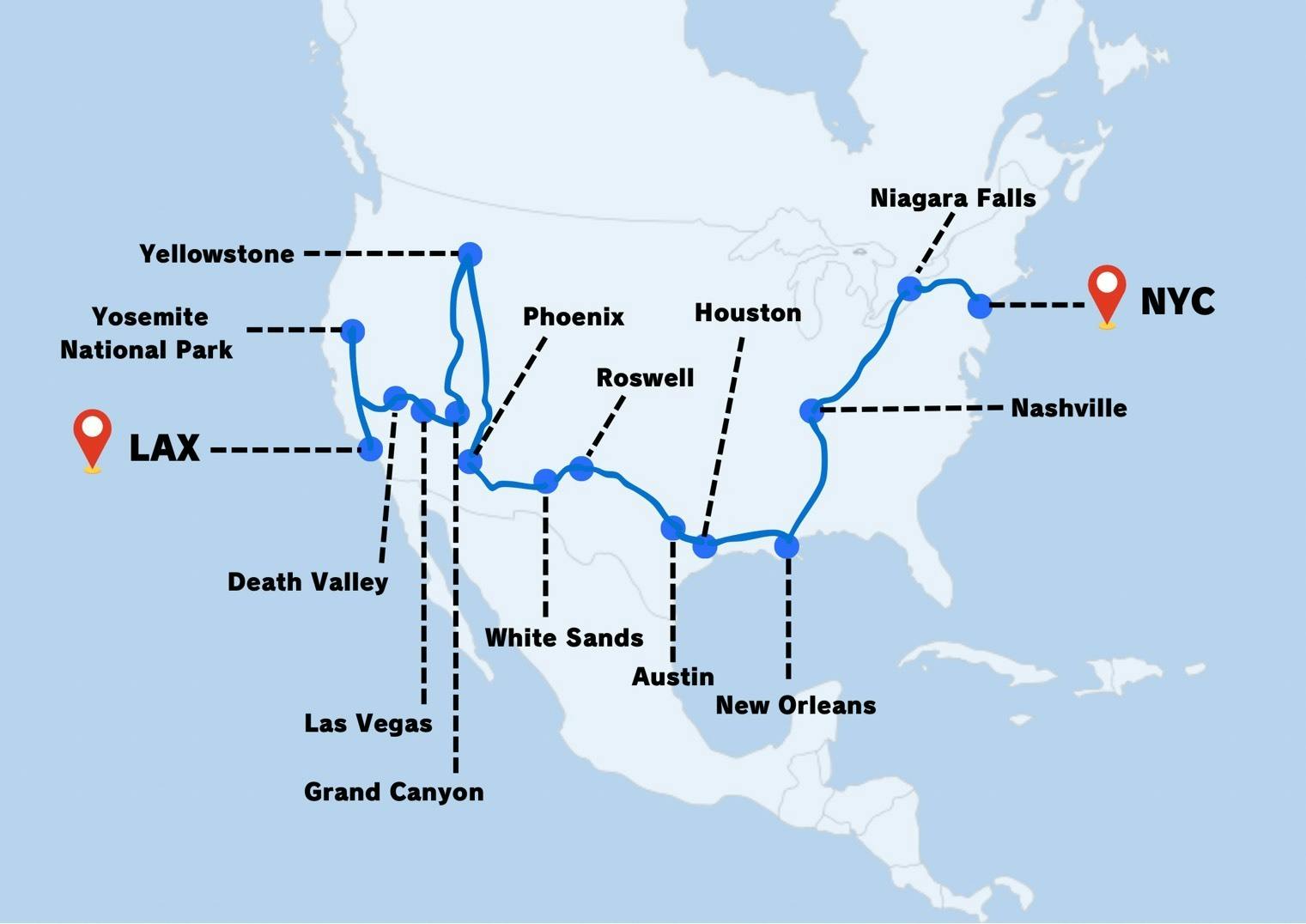アメリカ横断のルートは、以下を予定しています!(上から順番に行きます)