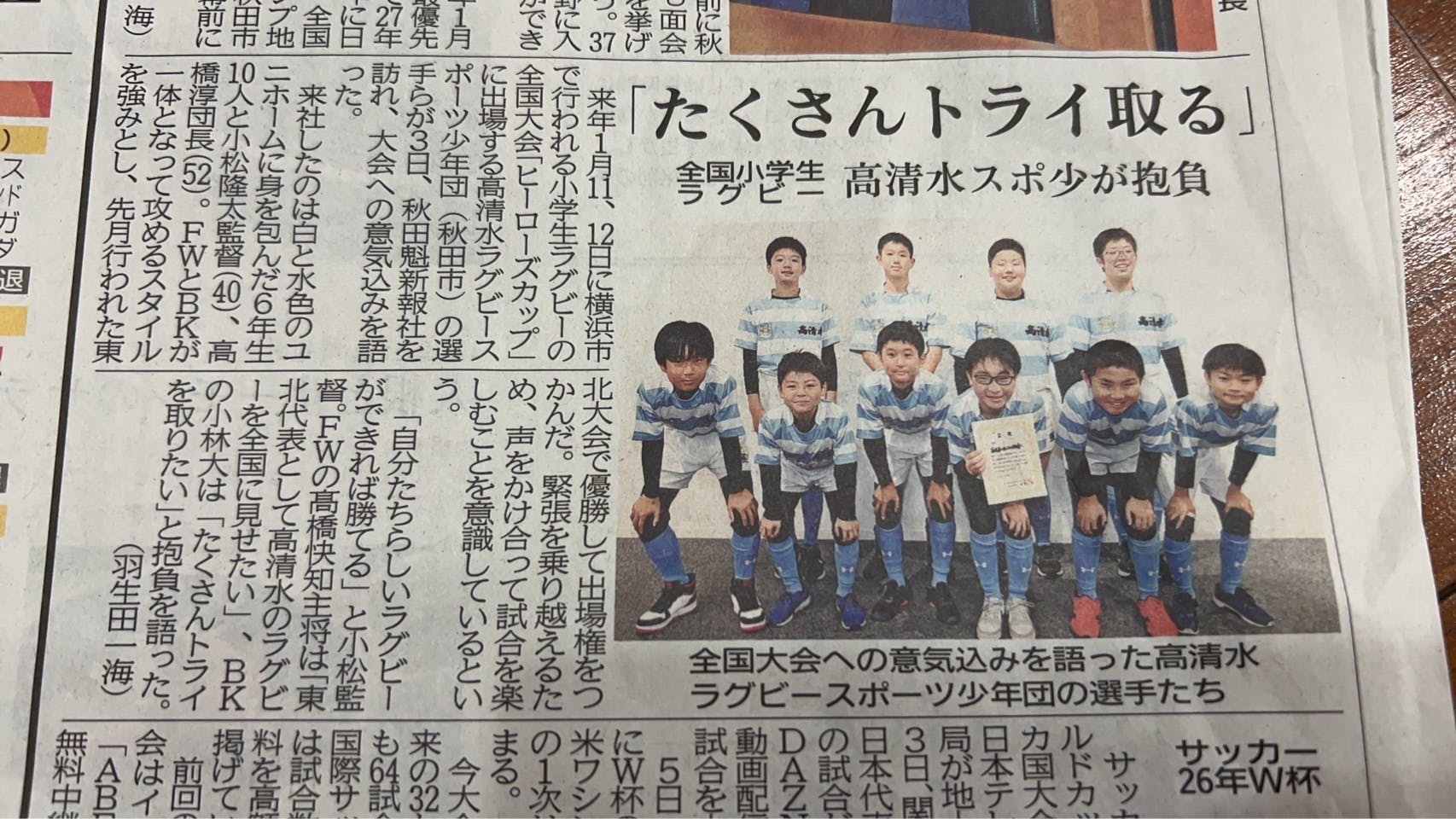 このたび、私たち高清水ラグビースポーツ少年団が新聞記事として紹介されました。