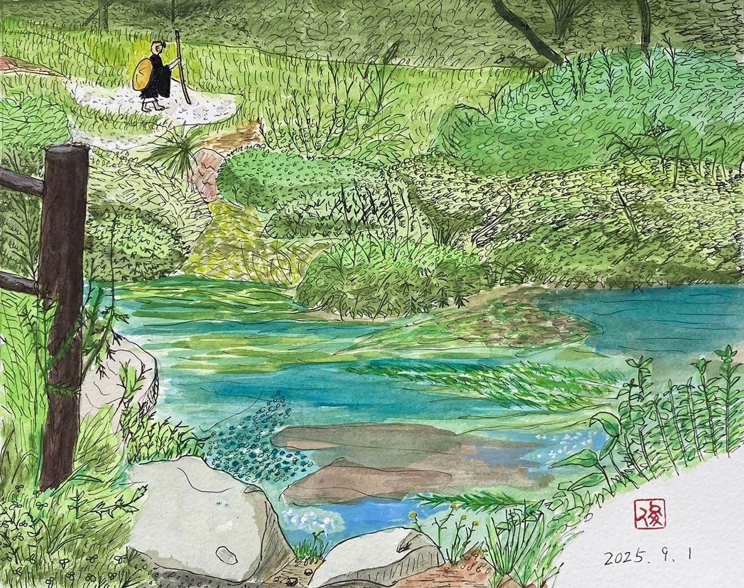 良い句とは、詩情があって、その詩の情景が目の前に現れてくるものです。私のスケッチの目的は、その句からほとばしる情景を、山頭火が詠んだ場所へ行って、山頭火が見たであろう情景、姿及びその場所を絵で表現することです。
