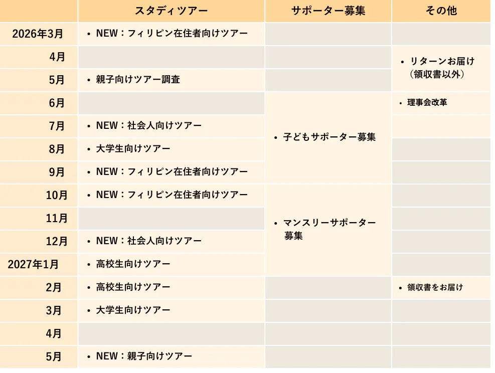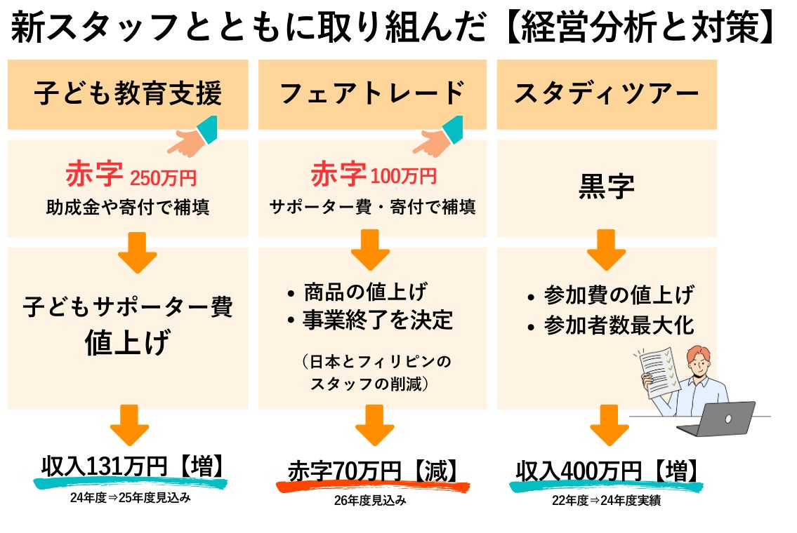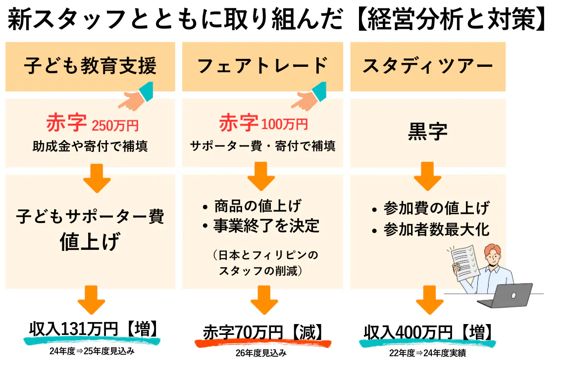 努力家で根性もある新職員の頑張りと、その他スタッフの支えのおかげで、2024年度には、改善策に取り組む前の2022年度と比べて、年間収入を480万円増やすことができました。(内訳:サポーター費収入80万円、スタディツアー収入400万円)