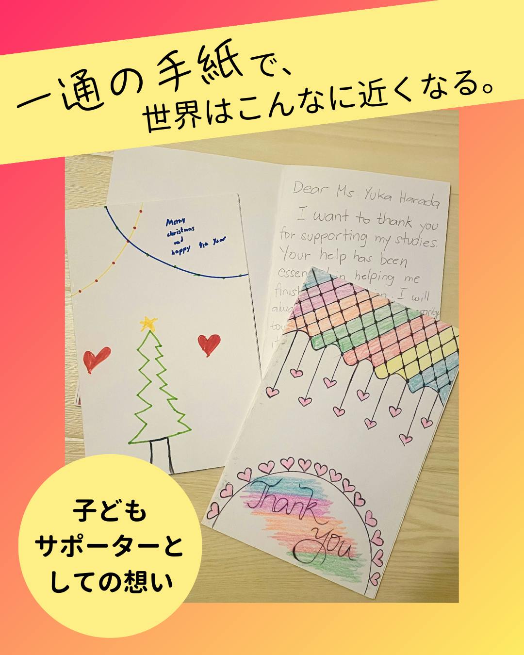 フィリピンの小学生から届いた五度目のクリスマスカード。添えられた写真を見て、その成長に顔が綻ぶ。 サポーターの子どもから届くメッセージカードの内容は、楽しいことが多いけど、時に悩みや困難も書かれている。でも、彼らは前を向いて歩み続け、その姿から私は生きる力をもらえている。