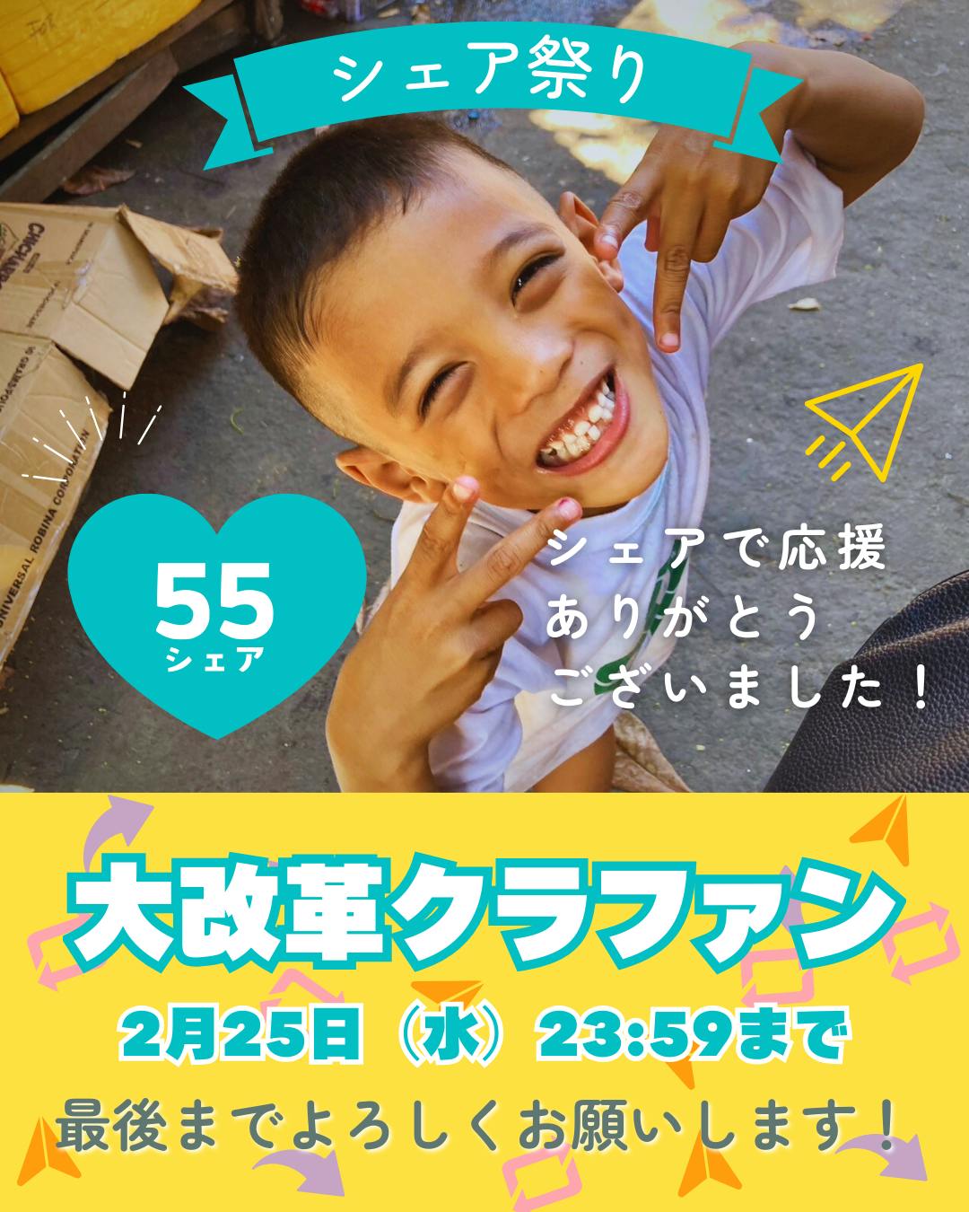 2026/02/18 09:00「え!もうあと1週間?!」そんな気持ちでこの投稿を書いています、アクセスの野田さよです。最終日の2月25日まで、残りあと7日間となりました。そしてここまでに集まったご寄付額は…▼これまでに集まったご寄付クラファンサイト上 1,861,000円アクセスへの直接寄付 931,000円ーーーーーーーーーーーーーーーー合計 2,792,000円133名もの方がご協力くださっています!本当にありがとうございます。目標額の450万円に対して、アクセスへの直接寄付も含めると、【達成率62%】ということになります。大きな目標を掲げていますので、達成は難しいの「かも」しれません。でも、最後まであきらめず、発信を続けていきたいと思います。そこで今日は皆さんにお願いです!今日は「シェア祭」です。みんなで一斉にアクセスのSNS投稿をシェアして、クラファンの最後の一週間を盛り上げていただけませんか?X:リポストInstagram:ストーリーで投稿Facebook:シェア「また後で寄付しよう」と思ったまま忘れてしまっている方、クラファンページがどこにあるかわからなくなってしまった方が、きっと少なからずいらっしゃいます。そんな方々に「あと一週間!今こそ応援お願いします!!」というメッセージをしっかりと届けるには、タスクチームメンバーの努力だけでは足りません。★シェア祭への参加方法今夜23:59までに、アクセスの公式アカウントから、クラファンについての投稿をシェアしてください! 前回の91シェアを超える【100シェア】をめざします。「いいね」や「保存」をしていただいたり、投稿のコメントをしてもらうことでも、その投稿がより多くの人に表示されやすくなります。あなたにとって参加しやすい方法で、ラストスパートを一緒に盛り上げていただけたらうれしいです。どうぞよろしくお願いいたします!認定NPO法人アクセス理事長 野田さよ↓↓↓ シェアはこちらから ↓↓↓*Instagram https://www.instagram.com/access_japan*X https://twitter.com/access_tour*Facebook https://www.facebook.com/accessPhilippinesJapan もっと見る