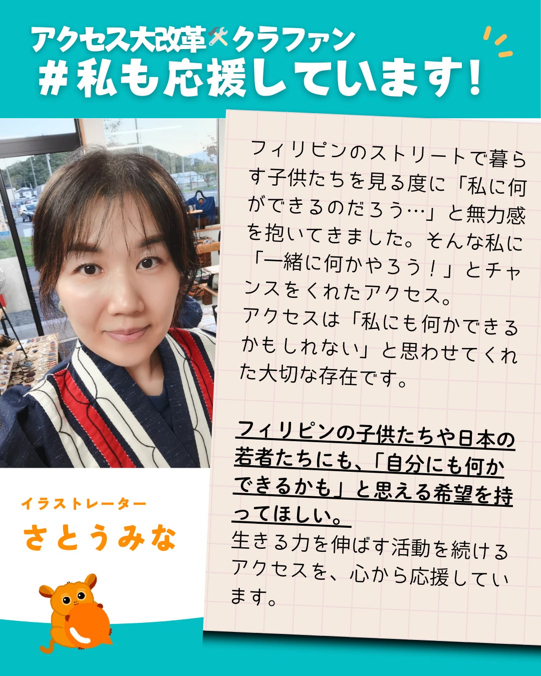 アートの力でフィリピンの子どもたちや女性を応援してきたイラストレーター、さとうみなさんから応援メッセージが届きました!