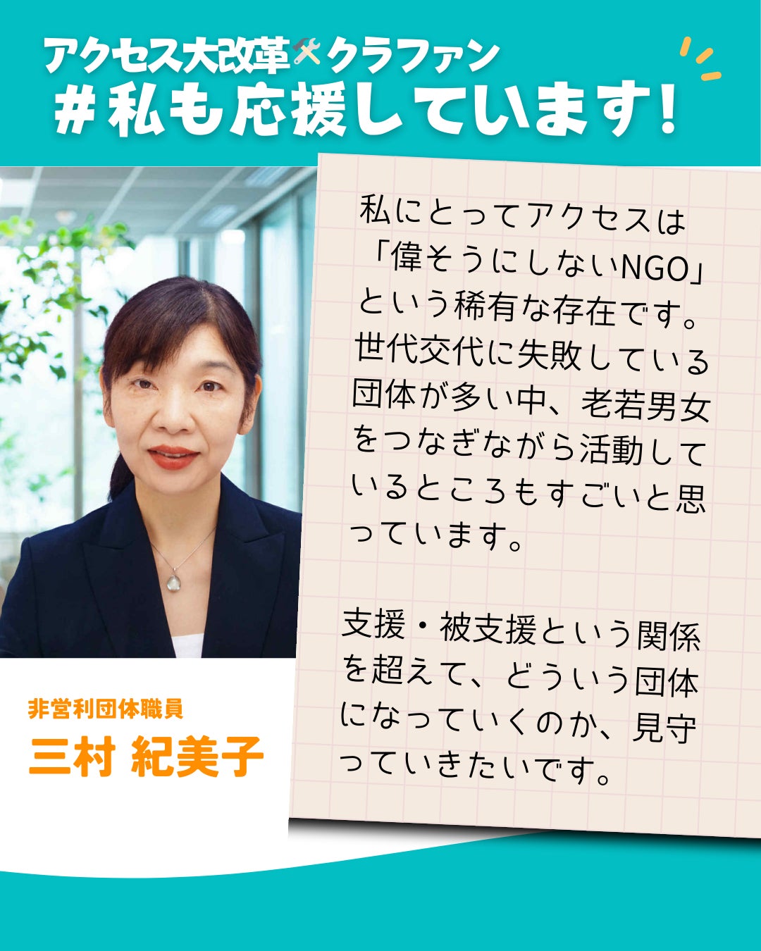 今日は、私がとっても尊敬するNGO・ソーシャルワーカーなかまの三村紀美子さんから応援メッセージが届いています。