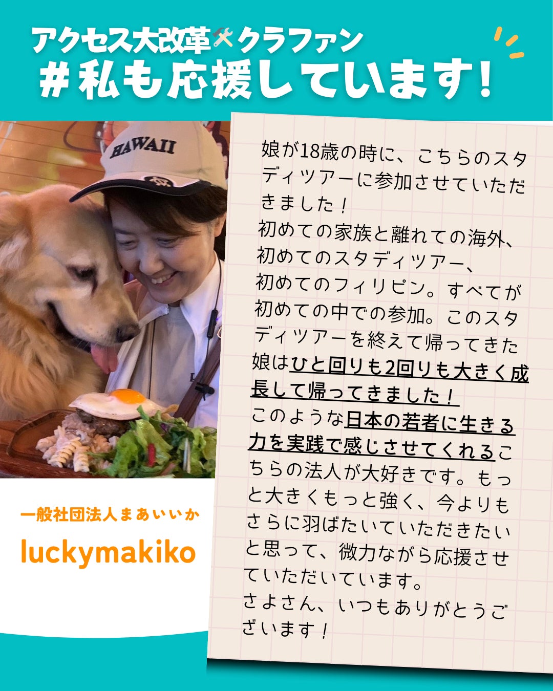 今日は、元スタディツアー参加者のお母さまで、子どもサポーターでもある、luckymakikoさんからいただいた応援メッセージをお届けします。