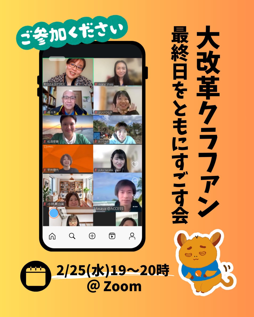 「あのイベントよかった」「あの投稿は心に響いた」、「クラファン終了後、改革派どう展開するの?」などなど、ざっくばらんにお話できたらと思います。ぜひ気軽にご参加ください。