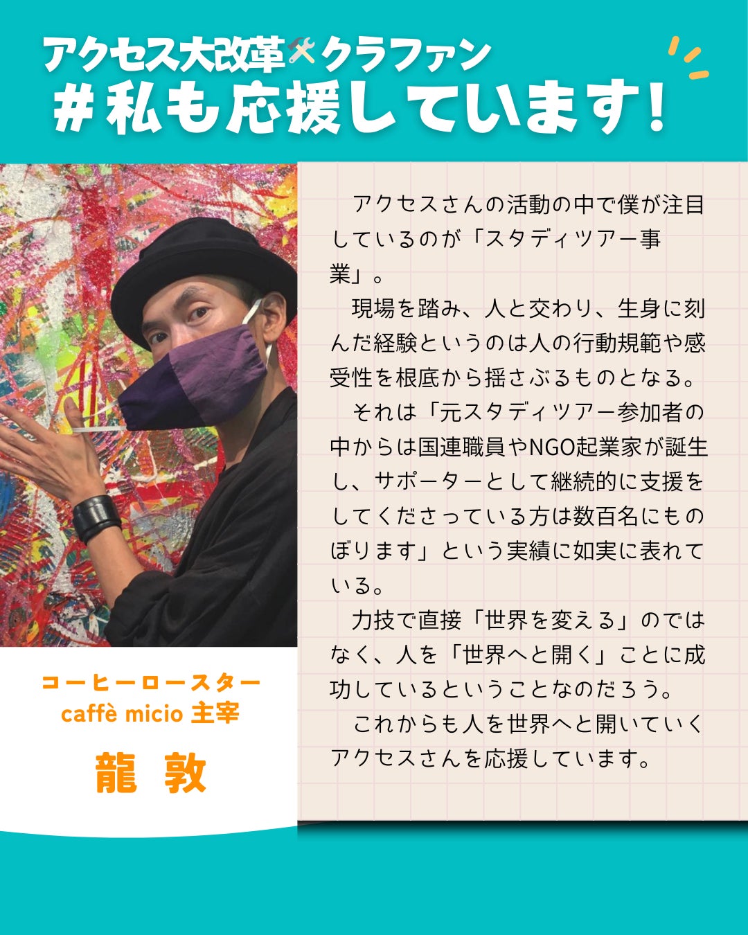 これからも人を世界へと開いていくアクセスさんを応援しています。