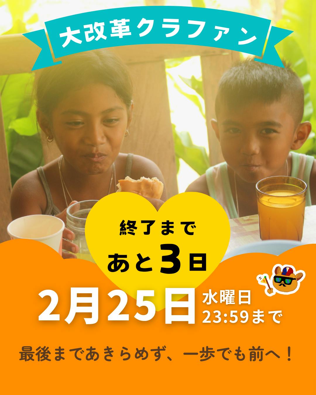 2026/02/22 15:29社会人ボランティアのゆうかです!皆さま、連日温かいご支援をいただき本当にありがとうございます。ここまで走り続けてきたクラファンもいよいよ残り3日。最初は、450万円という大きな目標に、正直私は漠然とした感覚しか持てずにいました。でも、皆さんのご支援が積み重なって、現在325万円まで集まっているんです…!▼これまでに集まったご寄付クラファンサイト上 2,218,000円アクセスへの直接寄付 1,032,000円ーーーーーーーーーーーーーーーーー合計 3,250,000円【寄付者数166名】沢山の応援の言葉もいただき、これだけ多くの方に支えられているのだと思うと本当に胸がいっぱいです。そして、ここまで想いを寄せてくださった皆さんの期待に応えるためにも。まだこのままでは終われないと思っています。残り3日、一人でも多くの方に私たちの想いを届けるために。アクセスがこれからも一人でも多くの「生きる力」を伸ばせるように。最後まで全力で取り組んでいきますので、応援いただけたら嬉しいです!ご寄付だけでなく、いいねやシェアも本当に力になります。どうぞよろしくお願いいたします!!▼SNSアカウントはこちら*Instagram https://www.instagram.com/access_japan*X https://twitter.com/access_tour*Facebook https://www.facebook.com/accessPhilippinesJapan もっと見る