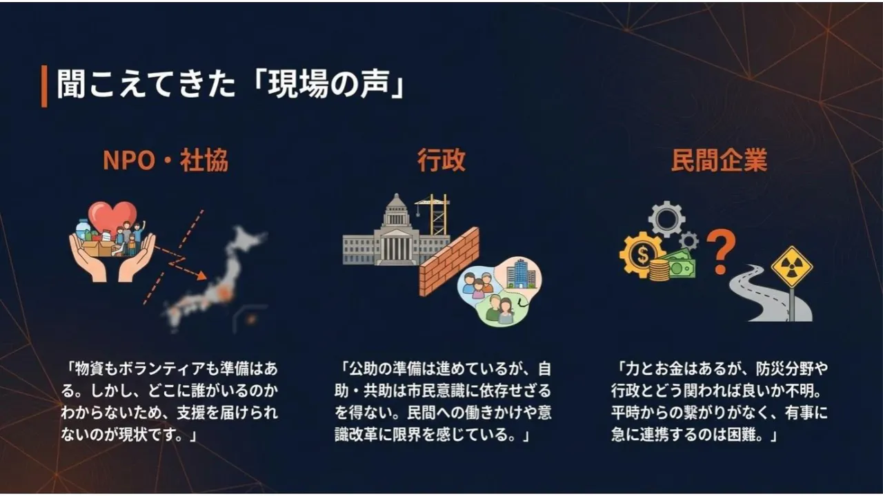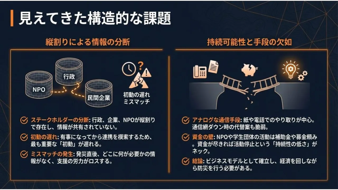 【NPO・学生団体】 物資も人員もいるが、初動で「誰がどこで助けを求めているか」が分からない。活動資金も続かない。