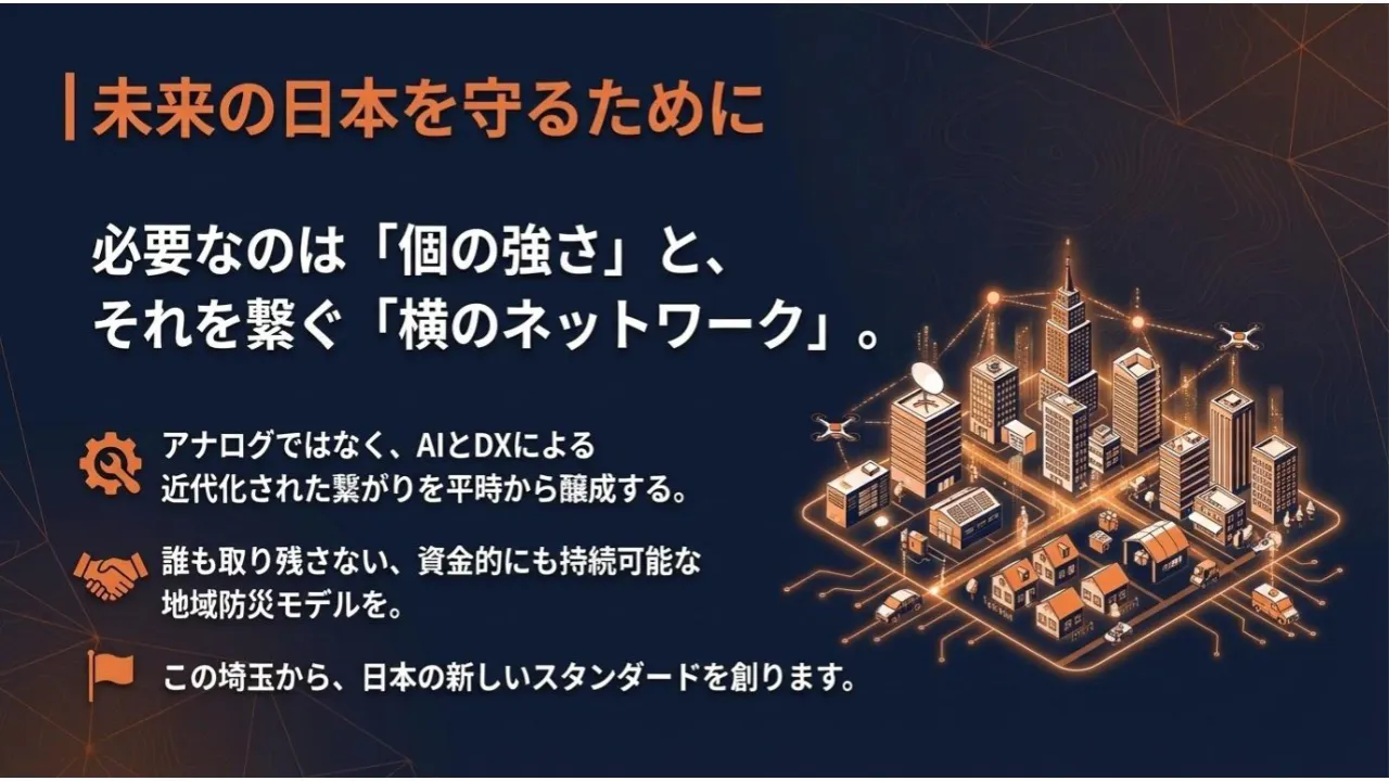 つまり、「それぞれ助け合うリソース(力)はあるのに、平時から繋がる仕組みがない」ということが最大の壁だったのです。 現在私は、埼玉県蓮田市を拠点に、元自衛官の知見を活かし、行政・NPO・企業を繋ぐ「誰も取り残さない防災」の実現に向けて奔走しています。