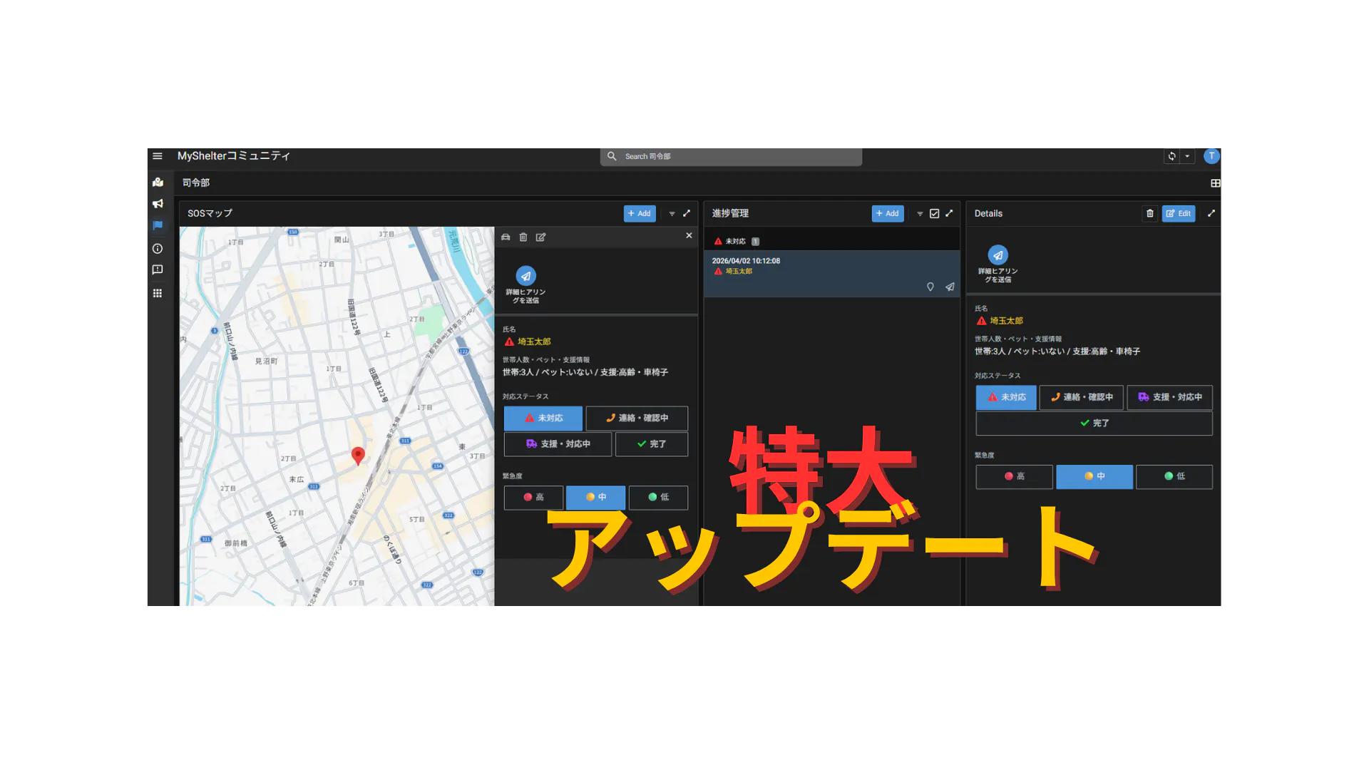 2026/04/02 14:46皆様の応援を力に、MyShelterが「プロ仕様のインフラ」へと劇的進化を遂げました!MyShelterのクラウドファンディングページをご覧いただいている皆様、MyShelter代表の末廣です! 本日は、皆様に2つの大きな前進(特大アップデート)をご報告させていただきます。① 【システム大進化】SOSを瞬時に把握する「司令部ダッシュボード」の完成!これまで、LINEから集まった安否情報はソフトで管理していましたが、この度、ノーコードツールを導入し、管理側のシステムをプロ仕様の「司令部ダッシュボード」へと劇的にアップグレードしました!■ 新システムのここがすごい!◆SOSマッピング(位置情報可視化):LINEから「救助が必要」と発信された位置が、瞬時にGoogleマップ上に赤いピンで表示されます。どこで助けが求められているか、一目瞭然です。◆トリアージ&進捗管理機能:「未対応」「連絡・確認中」「支援・対応中」「完了」といった対応ステータスをワンタップで変更可能。「緊急度(高・中・低)」も色分けされ、救助の優先順位(トリアージ)を的確に判断できます。◆要支援情報の可視化:画面右側の詳細パネルには、「高齢者」「車椅子」「ペットの有無」などが表示されます。この情報は住民自ら更新するので、最新の情報を元に現場に向かう前に行動計画が立てられ、二次災害を防ぎます。誰でも使える「LINE」の手軽さはそのままに、裏側の管理システムは何千万円もする自治体向けシステムと同等の機能を、私たちの得意とするスモールIT技術で実装することに成功しました!② 【現場のリアルな前進】地元蓮田市の自治会連合会会長と導入合意!システムの進化だけでなく、地に足のついた活動も大きく前進しています。 先日、地元である蓮田市の西城自治会長(兼 蓮田市自治会連合会会長)と打ち合わせを行い、MyShelterの導入に向けて、地道な住民説明会を実施していくことで正式に合意いたしました!打ち合わせの中では、以下のような「現場のリアルな課題」についても具体的な対策を練り上げました。◆スマホを持っていない方(ご高齢者等)への配慮:「デジタルで瞬時に情報を集約するからこそ、そこで浮いた私たちの『初動の労力と時間』を、スマホを持たない方への直接の救助・確認に100%注ぐことができる」という方針で合意。さらに、自治体や学生と連携した「スマホ教室」なども企画していきます。◆運営費用とスポンサー集め:システムの維持費については、自治会長と一緒に地元企業を回り、「地域の命を守る広告スポンサー」として協賛をお願いしていくという、最強のタッグ営業が実現しそうです!【最後に】皆様からのご支援と応援メッセージが、私のシステム開発のモチベーションとなり、地域を巻き込む泥臭い活動の原動力になっています。「いざという時に、絶対に逃げ遅れを作らない社会」へ向けて、MyShelterはさらに加速していきます。 引き続きの熱いご支援と、SNS等でのプロジェクトの拡散・シェアを何卒よろしくお願い申し上げます! もっと見る