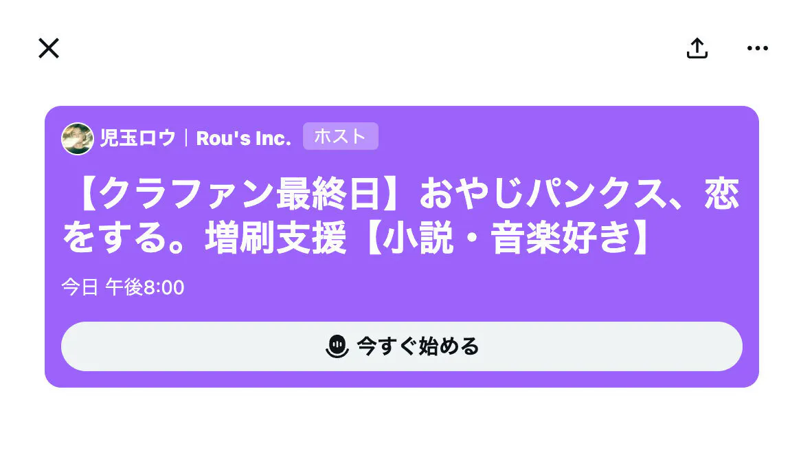2026/03/31 19:49クラファンも残すところ4時間ちょっととなりました。このあと20時からXにてスペースをやってみようと思います。初めてなのでグダグダ&あたふた確定だけど、頑張ってみる。村上龍、花村萬月、エックス、ブルーハーツ、ハイスタetc....↓20:00〜こちらよりどうぞ↓https://x.com/i/spaces/1vKpPrBlgjdKE?s=20※1回目大失敗したので再挑戦しております もっと見る