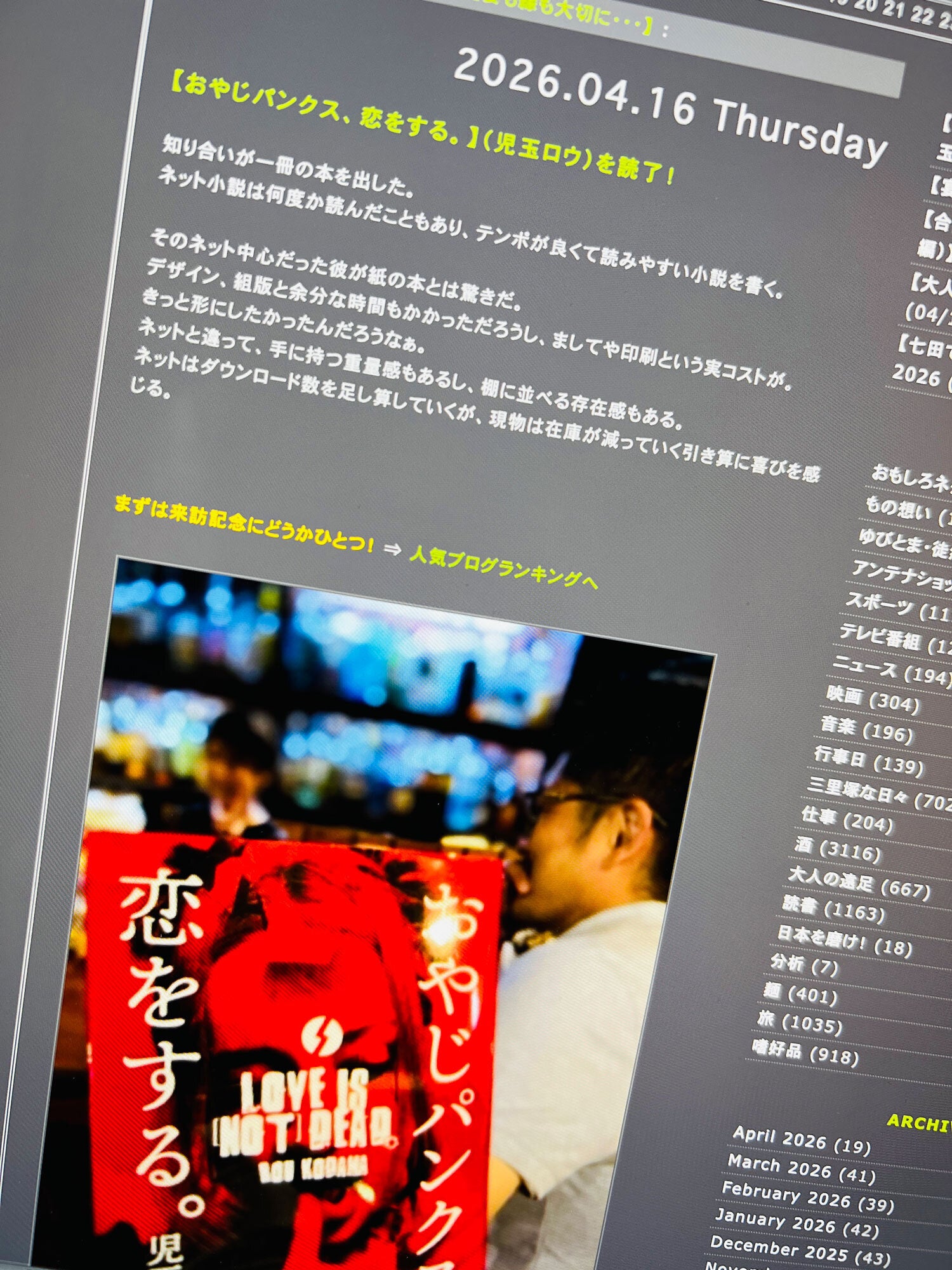 2026/04/16 18:02サラリーマンブログランキング第1位の「じゅずじの旦那」にて、『LOVE IS [NOT] DEAD.〜おやじパンクス、恋をする〜』をご紹介いただきました。【おやじパンクス、恋をする。】(児玉ロウ)を読了!https://juzji.jugem.jp/?eid=12549実はブログ主さんとはちょっとした知り合いでして、何度かお酒を飲んだこともあります。だいぶご無沙汰しちゃってますが、どこからか僕の本を知り、読んでくださったみたいです。小説の感想(あらすじ?)まで書いてくださってありがたい限り。じゅずさん、ありがとうございました! もっと見る