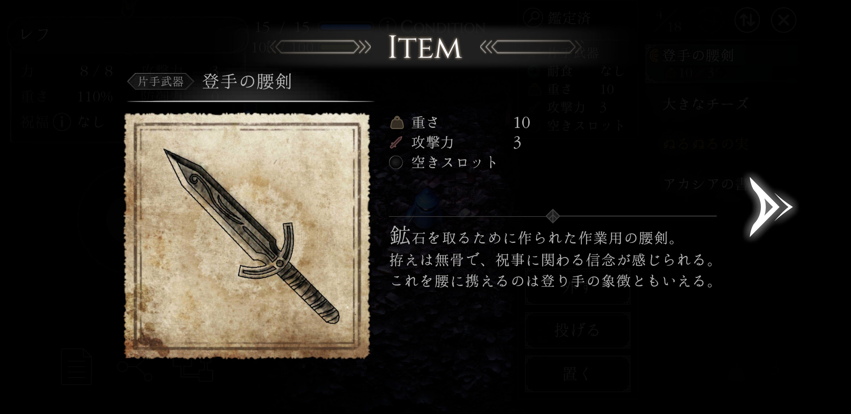 鑑定、未鑑定などの道具ステートは道具名の色、または簡易説明ウインドウから確認します。