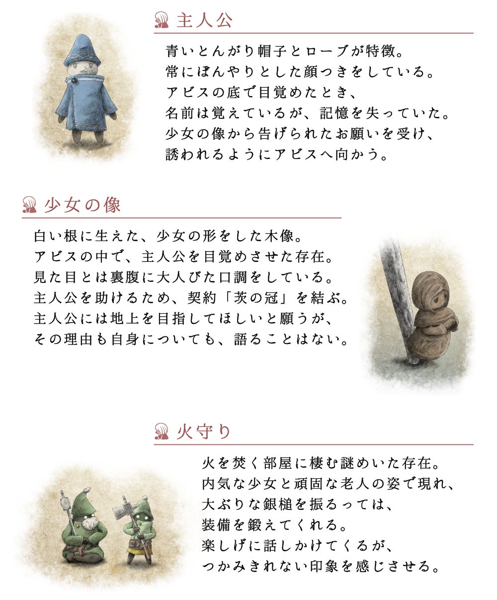 記憶を失い、異形の地下迷宮「アビス」で目覚めた主人公が、不思議な少女の像に導かれ、深部から脱出を目指します。