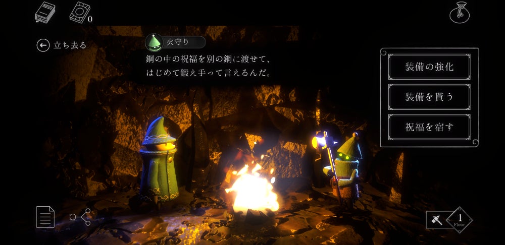 鍛えの部屋では、鍛治が得意な火守りが出迎えてくれます。