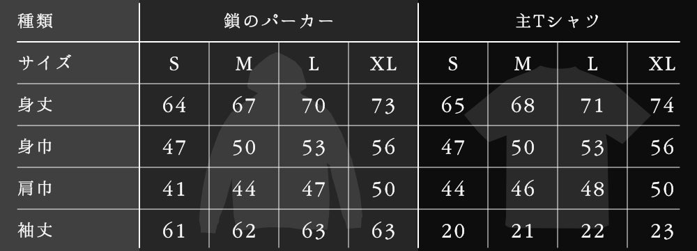 最後にパーカー、Tシャツのサイズ参考一覧表(単位:cm)です。