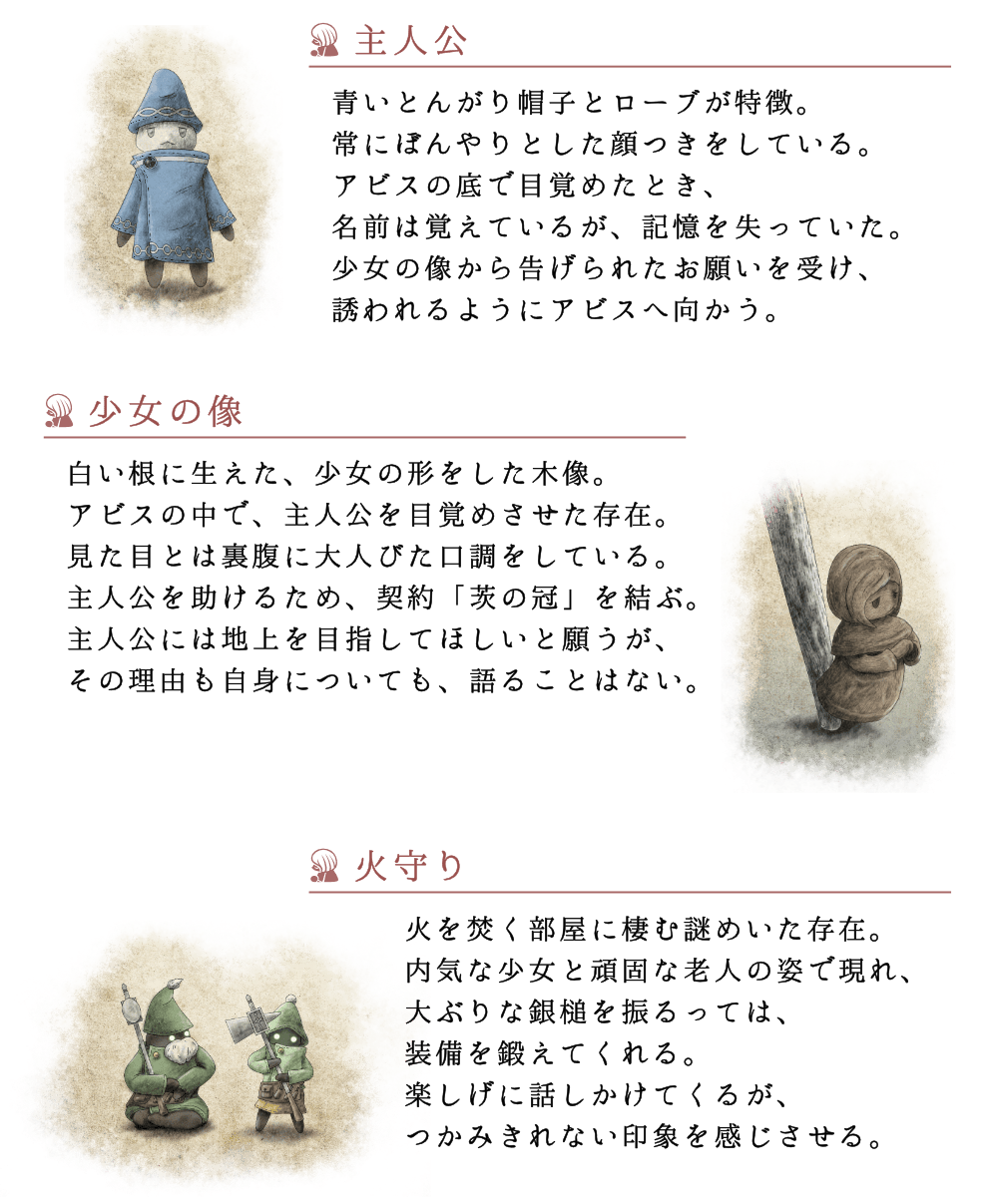 記憶を失い、異形の地下迷宮「アビス」で目覚めた主人公が、不思議な少女の像に導かれ、深部から脱出を目指します。