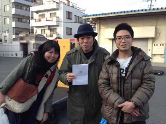 2014/02/26 20:02こんばんわ! 吉原芸術大サービスまで、6週間!! キャンプファイヤーの掲載期限は残すところ、6日!! (一週間を切ってしまいました...) 毎日どきどきしながら、準備を進めています。 そんななか!ですが、 吉原芸術大サービスの事務局が 近くのまち、千住のアートプロジェクトに出張することになりました! 大友良英「千住フライングオーケストラ」! あまちゃんで一躍有名になった大友良英さん。一緒に写真を撮っていただきました。 「千住フライングオーケストラ」は、 足立区で行われている「音まち千住の縁」というプロジェクトの企画です。 凧で音楽をつくり、空に飛ばす、まさに空飛ぶオーケストラです。 会場は、足立市場!お魚の市場です。 凧だけではなく、飲食店の出店や、おもしろい縁日など、盛りだくさん。 私たちは、「おもしろい縁日」の枠に参加します。 吉原芸術大サービスの事務局でトランスフォーマー・美術家の橋本匠が、 「オノマトペラッパー」という作品で参加します。 とてもおもしろいパフォーマンスになりそう! 3月21日(金・祝)は、ぜひ、足立市場にお越し下さい。 吉原から芸術をフライングでデリバリー大サービスします! 企画詳細 音まち千住の縁 大友良英「千住フライングオーケストラ」 3月21日 14:00〜19:00 会場:東京都中央卸売市場 足立市場[足立区千住橋戸町50] http://aaa-senju.com/otomo もっと見る