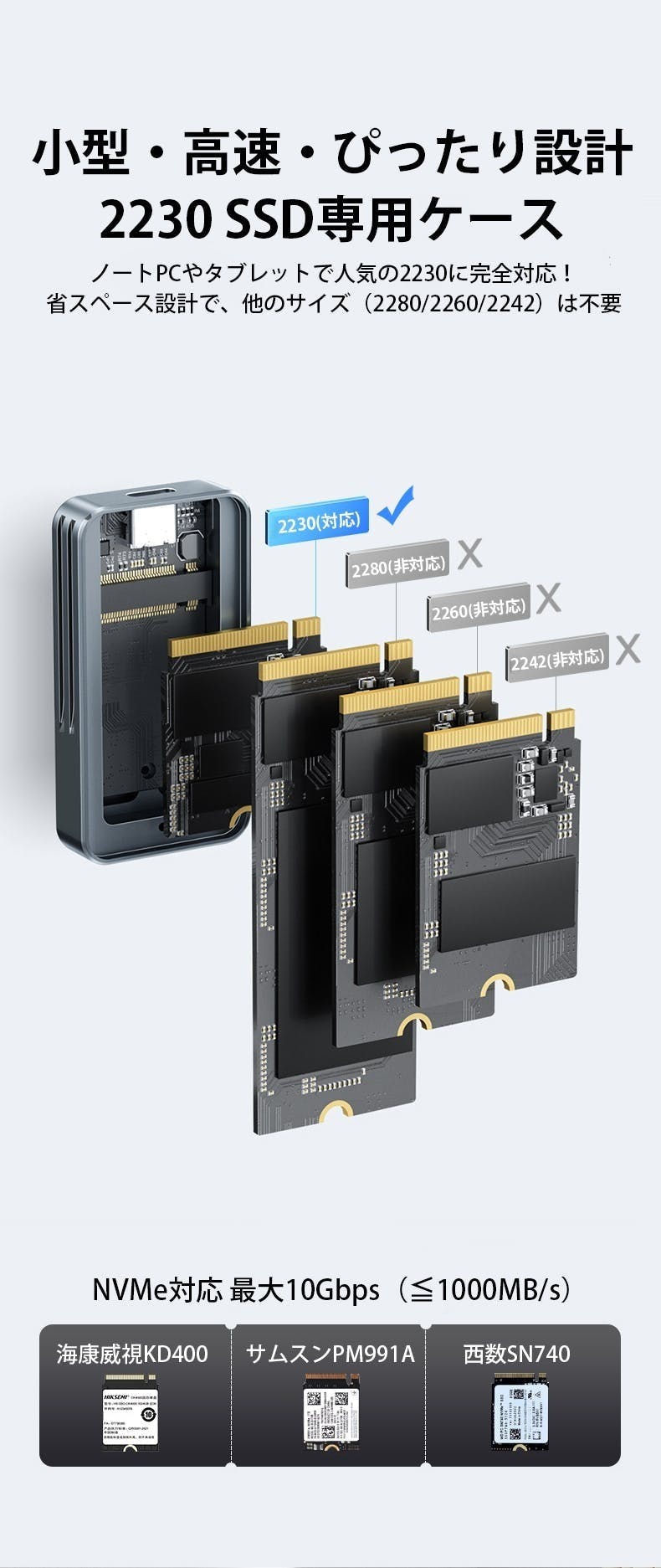 また、2230専用設計により、無駄なスペースを省いた超コンパクトな筐体を実現。携帯性に優れ、ノートPCやゲーム機との組み合わせにも最適な上、必要なデータをスマートかつ手軽に持ち運べるため、大きくてかさばる従来のSSDケースに悩まされることはなくなります。