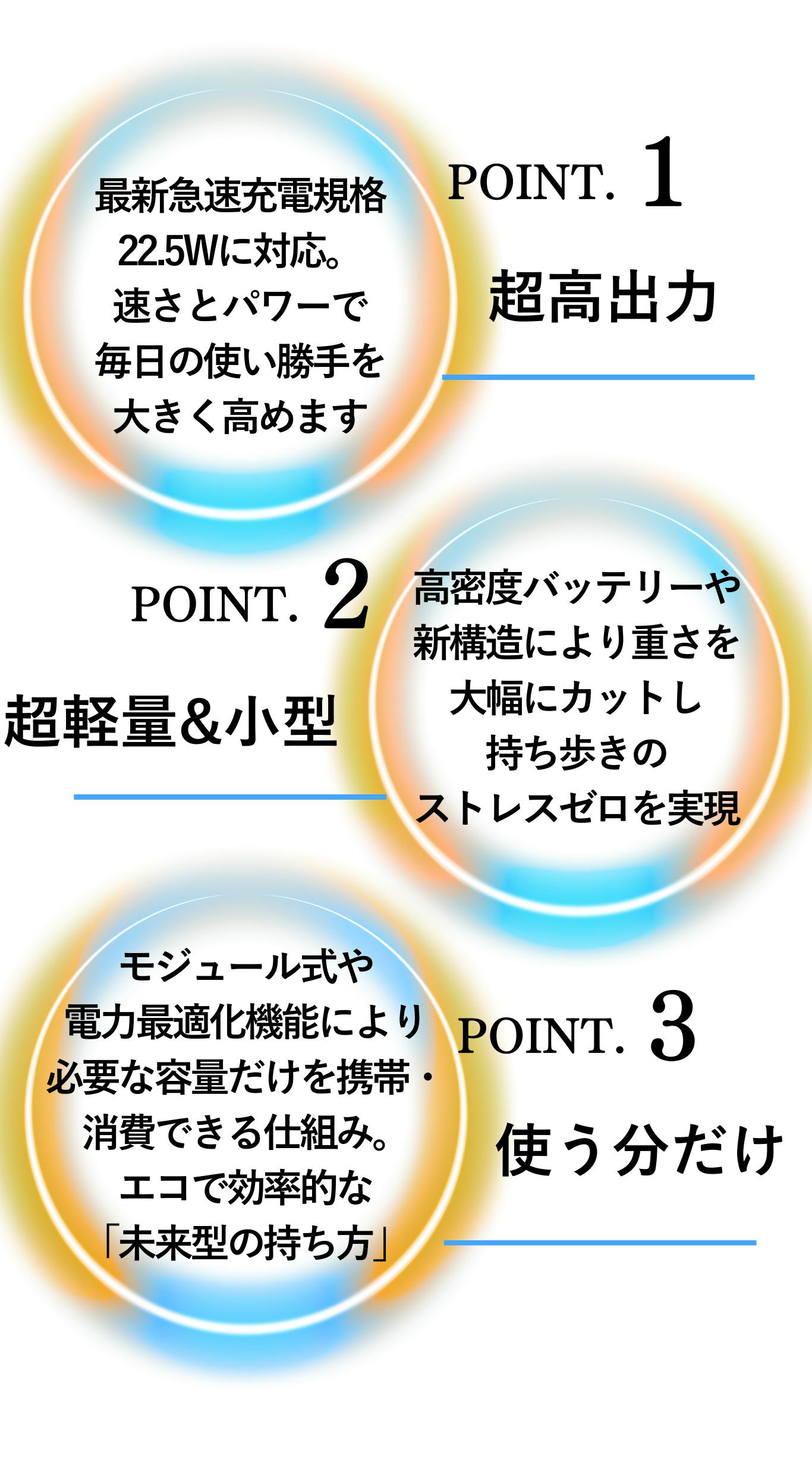 過充電・過放電保護/出力短絡保護/過熱保護/低電圧保護/高効率だけでなく、徹底した安全設計であなたのデバイスを守ります。