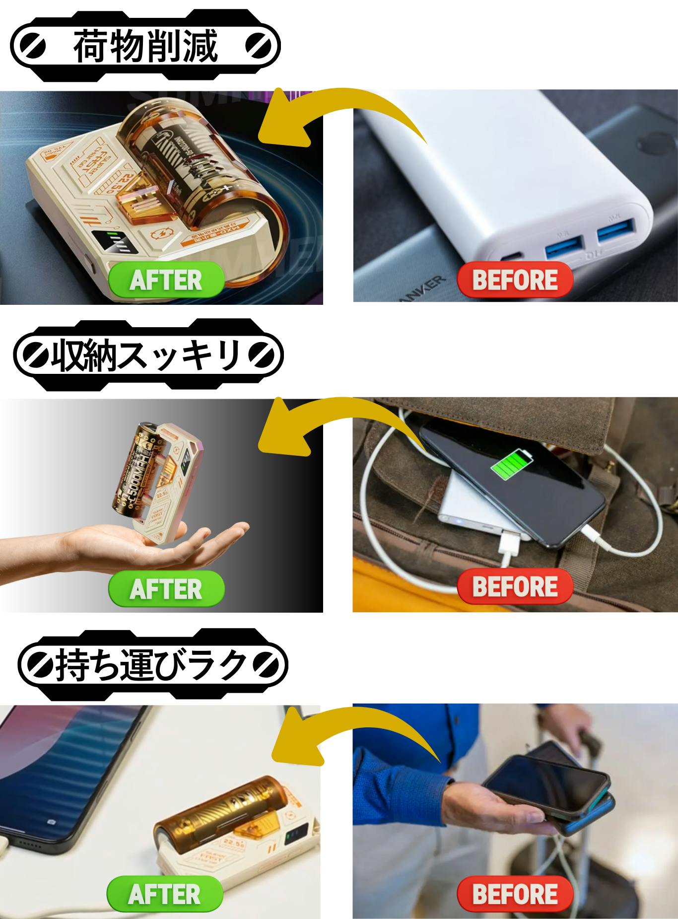 従来のモバイルバッテリーは充電待ちが長い…。この製品は 20W高速入力対応だから、約2時間台で本体もフルチャージ。次の外出にすぐ持ち出せます!